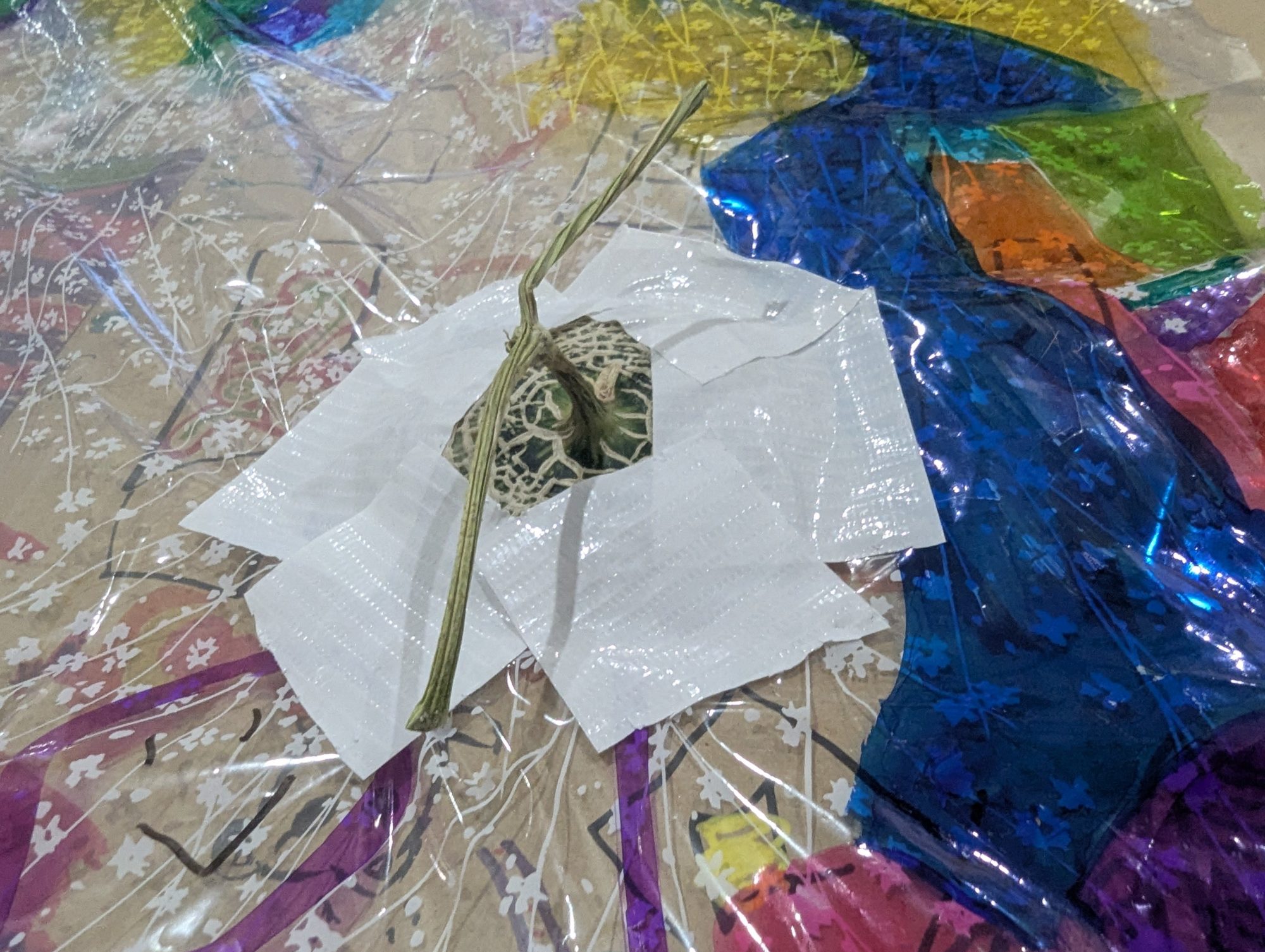とてもおもしろくて、力作の「宇宙船」ですね!3ヶ月かけてコツコツ作った時間の重さが、作品のすみずみから伝わってきます。色とりどりのフィルムが光に反射してキラキラし、まるで本当に宇宙空間を飛んでいるような雰囲気です。