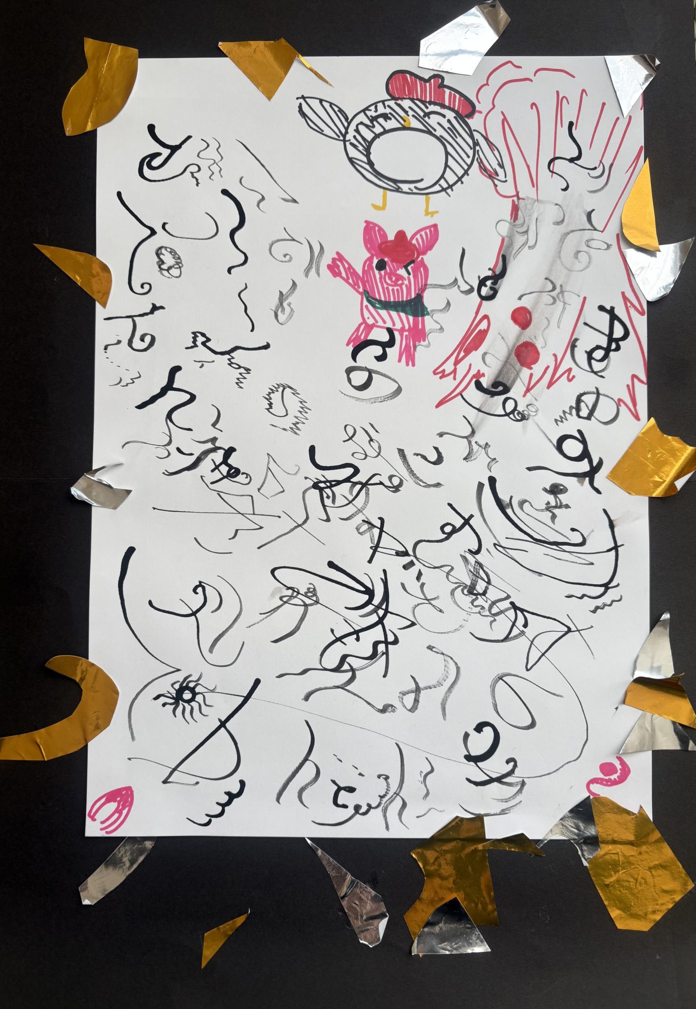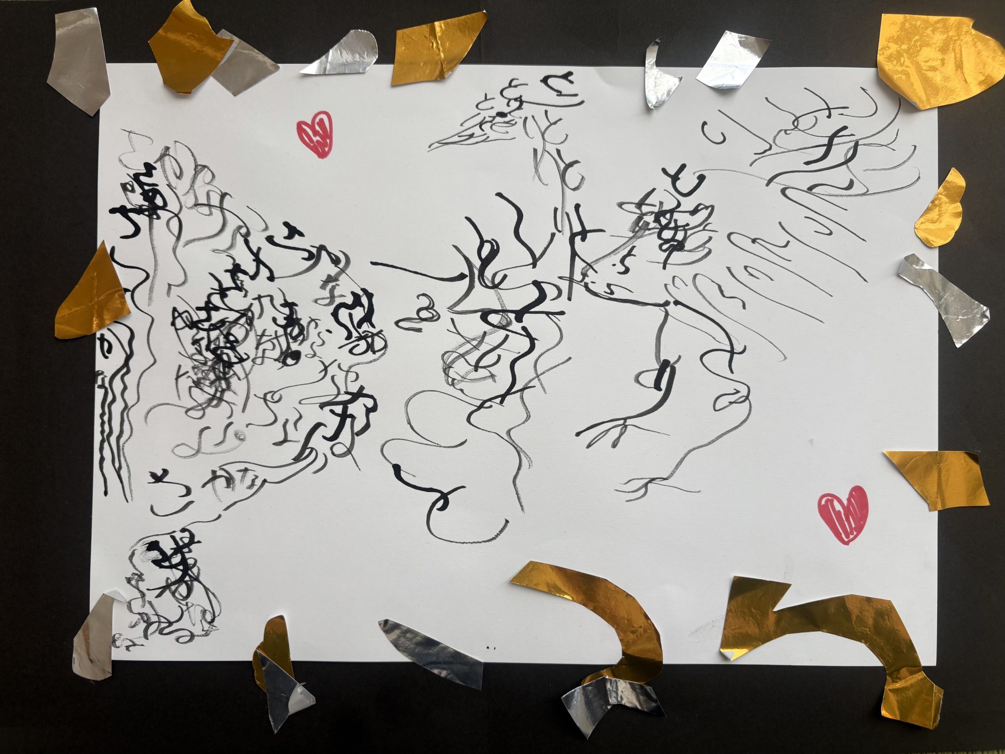 金や銀の紙片が動きのある飾りになっていて、にぎやかで楽しい“Yuiさんのカリグラフィー”が完成しましたね。