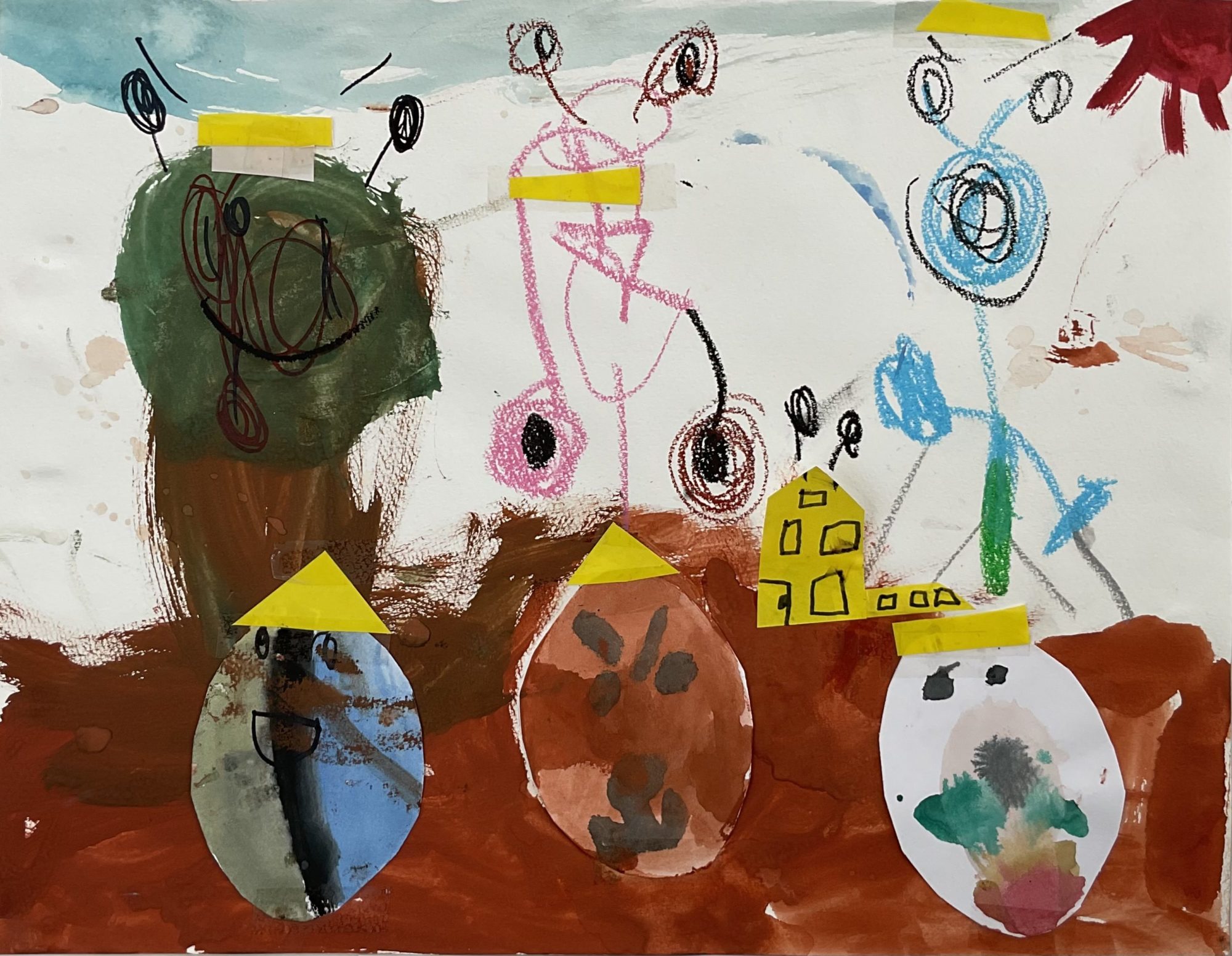 大きな画面の中で、たねの形からおうちが生まれてくるようすが、のびのびと広がっています。えのぐのにじみや、クレヨンやカラーペンの線、紙を切って貼った黄色い屋根が合わさって、いろいろな材料が一つの世界になっていますね。上のほうには不思議ないきものや空があって、下の土の色との対比も印象的です🌱🏠