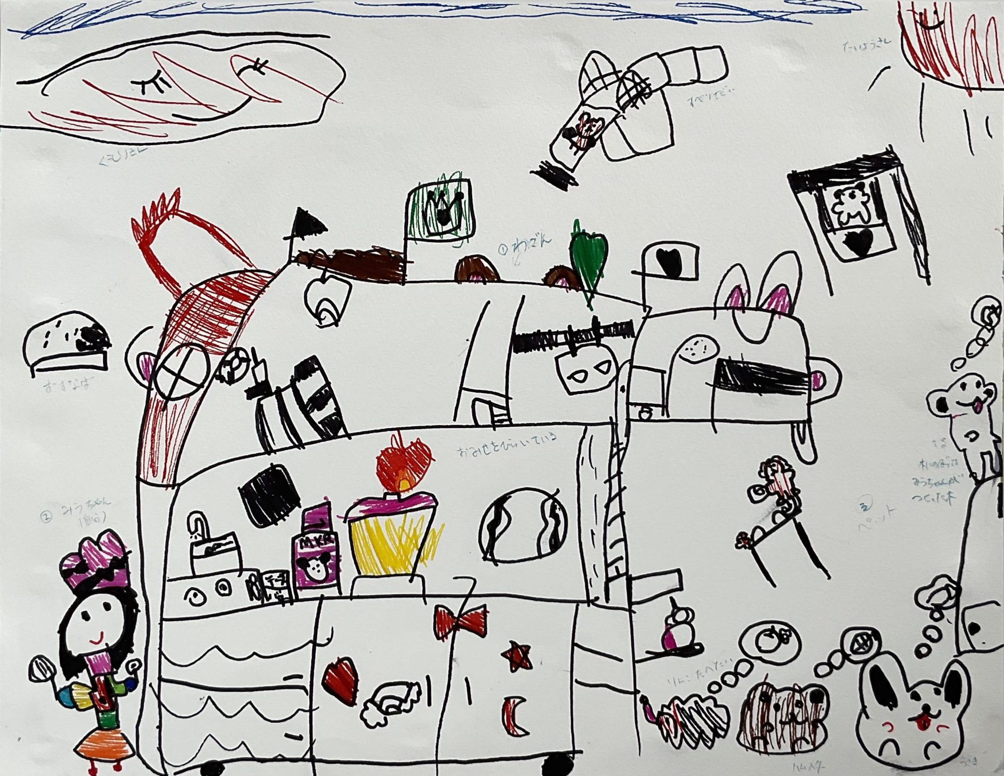 画面いっぱいに「ふしぎなちいさいもりのきっちん」の世界が広がっていて、見ているだけで冒険している気持ちになります。おなべやたべもの、どうぶつや人、そらをとぶものまで、たくさんの形がつながっていて、線の強さや色のちがいから、思いついたことを次々に描いていった様子が伝わってきます。🫕🌳
