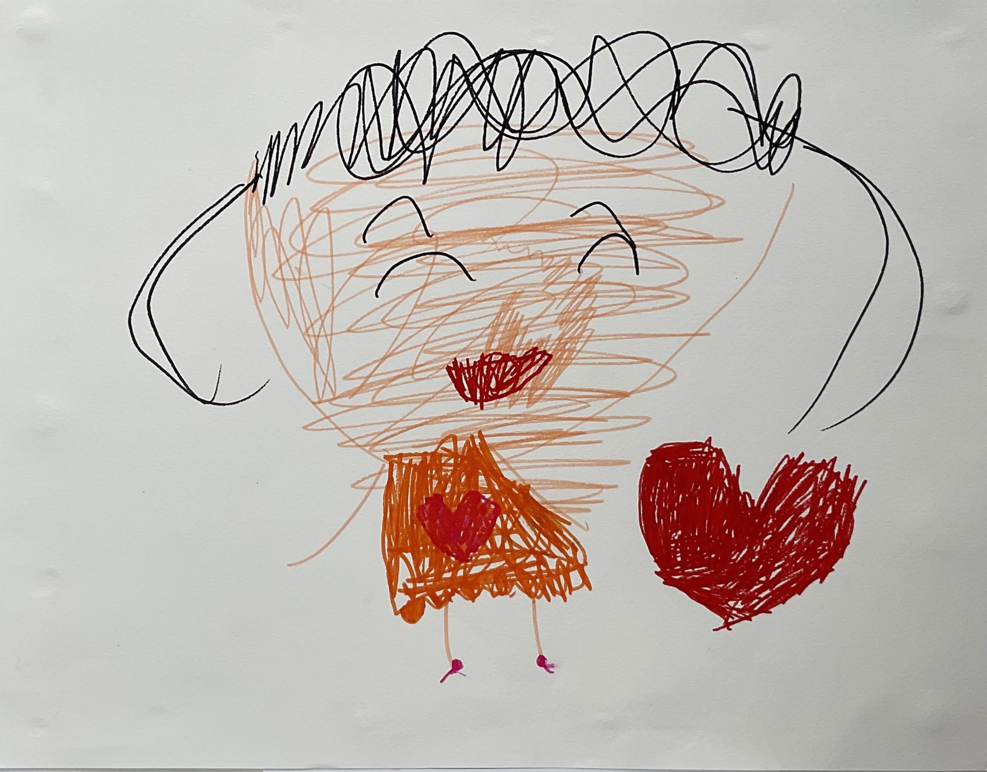 やさしい茶色の線で大きく描かれたおかあさんの顔が、画面いっぱいに広がっています。にこっとした目と赤い口から、あたたかい気持ちがまっすぐ伝わってきます。服のまんなかのハートと、となりにある大きなハートも、とても大切な思いを感じさせますね。❤️😊