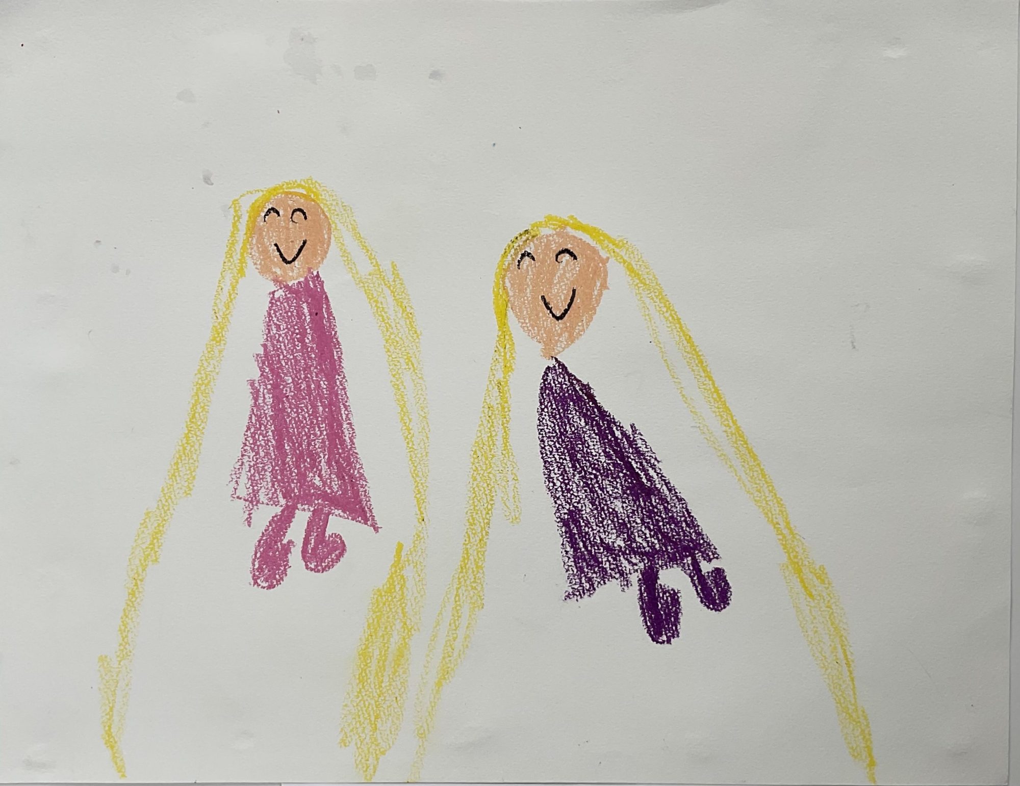 ピンクとむらさきの服の色のちがいから、それぞれのラプンツェルの気分や個性も伝わってくるようです。私は、この絵から、たのしそうに並んでいる安心した気持ちを感じました。😊🎶