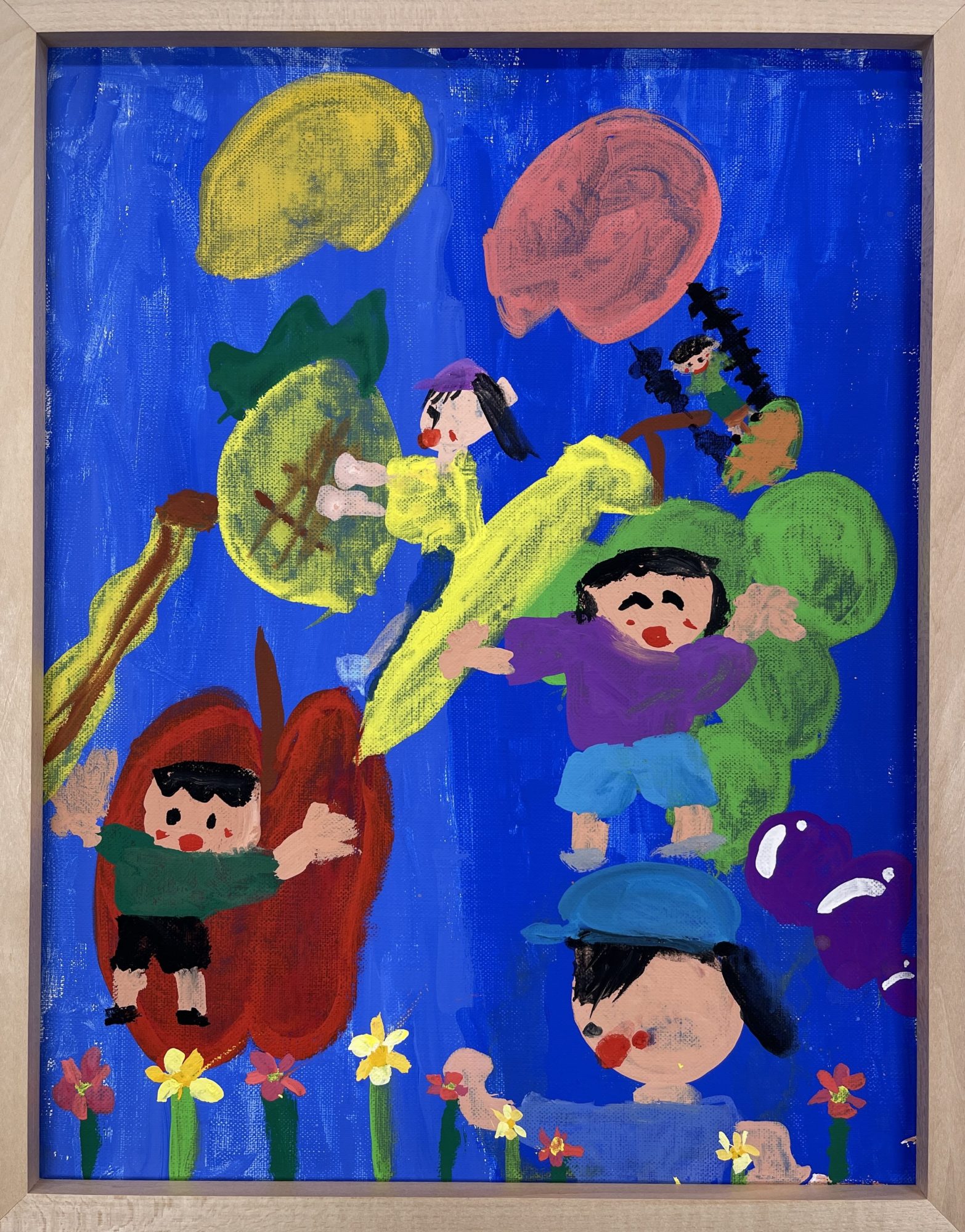 青い空いっぱいに広がるフルーツの形や色がとても生き生きしていて、画面全体が楽しい動きに満ちています。🍎🍌