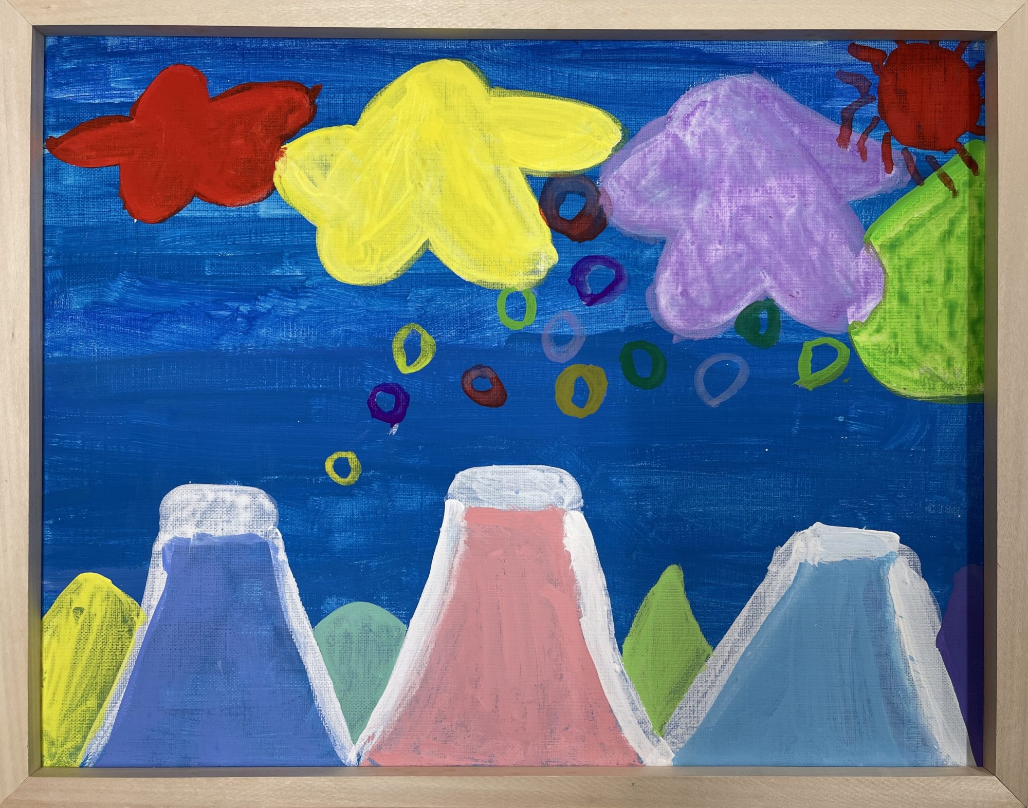 わかめせんせい 先生2025年12月28日 12:43 PM めいさん、この作品を見て、まず色のひびきの明るさに目をひかれました。 青い空に、赤・黄色・むらさきの雲や、カラフルな輪っかが浮かび、ふじ山も一つ一つ色や形がちがっていて、とても楽しい世界です🌈🗻 のびのびした筆の動きから、描くこと自体を楽しんでいる気持ちが伝わってきました😊 色を思いきってえらび、くり返しの形でリズムを作れているのは大きな力です。次は、山の高さや並び方を変えたら、どんな景色になるでしょう🎨✨ この空には、どんな音や気分が流れていると思いますか? ログインして返信する ↓