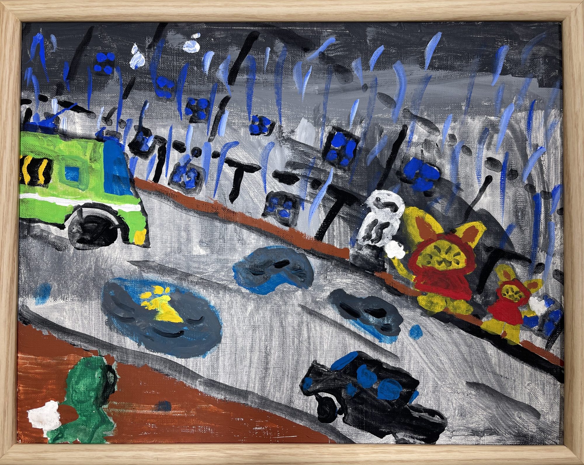 筆の動きが速く力強く、雨の音や街のざわめきまで聞こえてくるようで、物語の一場面を切り取った発想がとても豊かです🎨