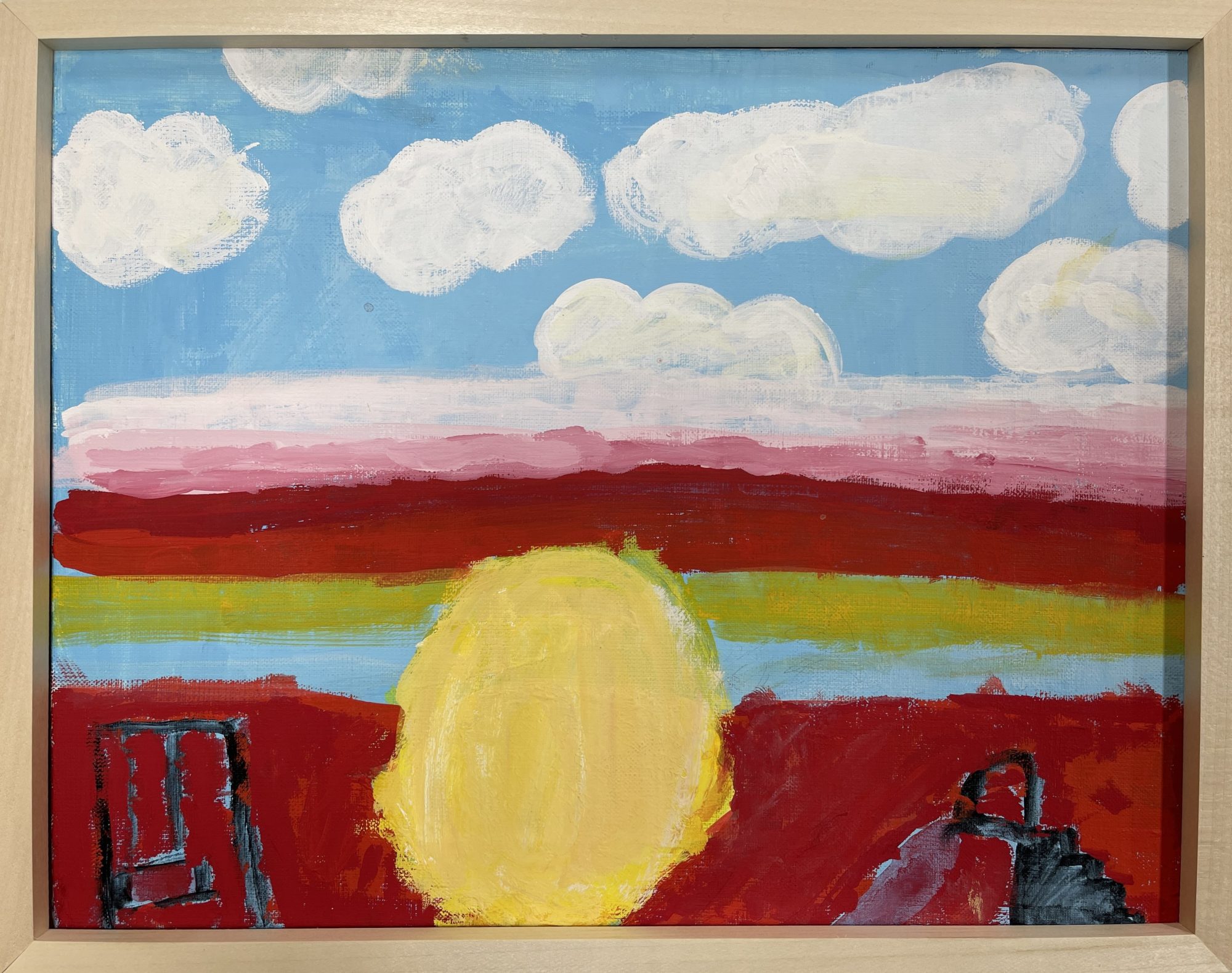 画面いっぱいに広がる空と地面、そのまんなかに置かれた大きな夕日が、とても印象的です。
