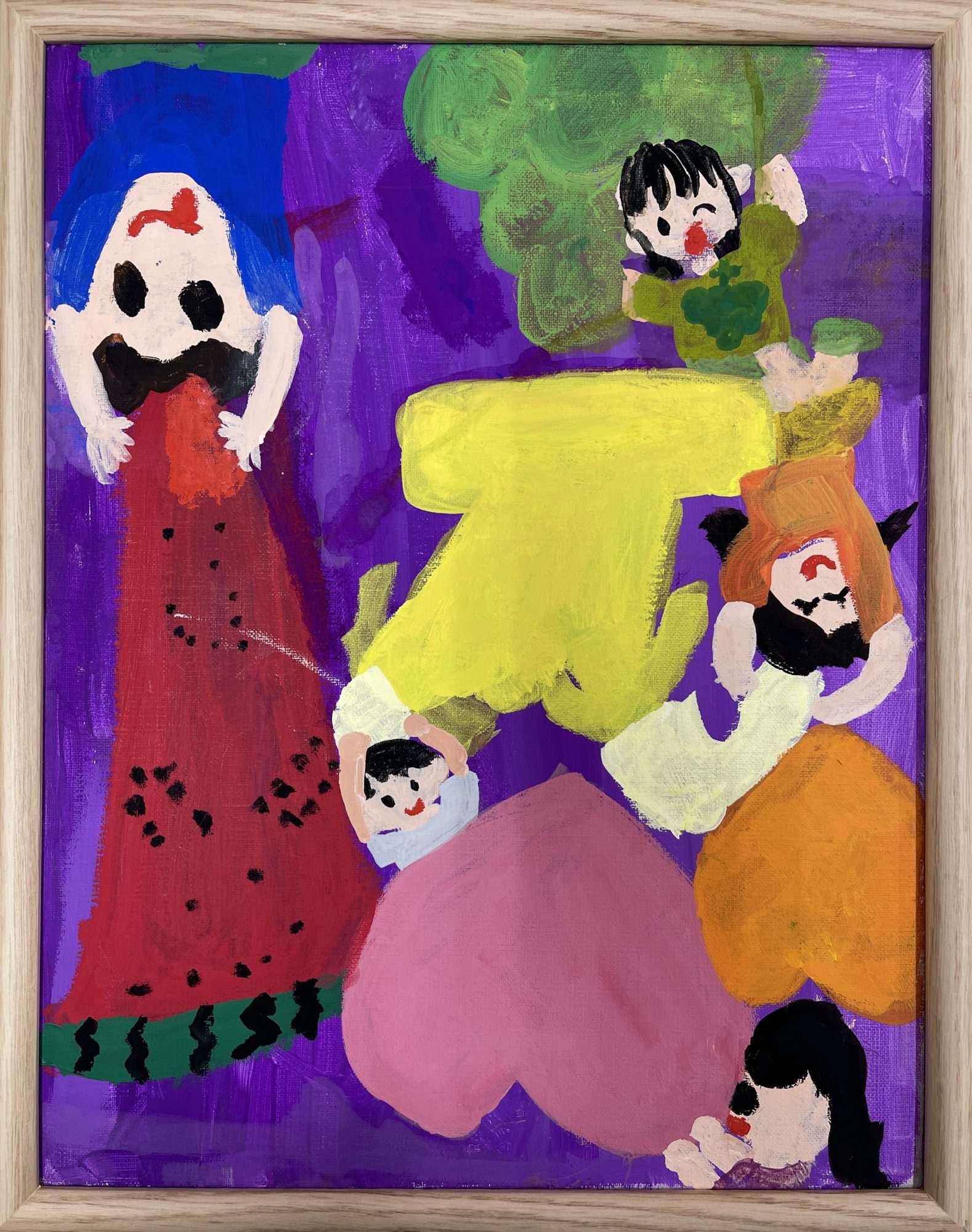 紫を基調にした背景の中で、人物やフルーツが大きく大胆に配置され、色と形がぶつかり合う楽しさが画面いっぱいに広がっています🍇✨ 特に黄色やピンクの大きな形が、世界が一気に変わった瞬間を強く伝えてくれます。