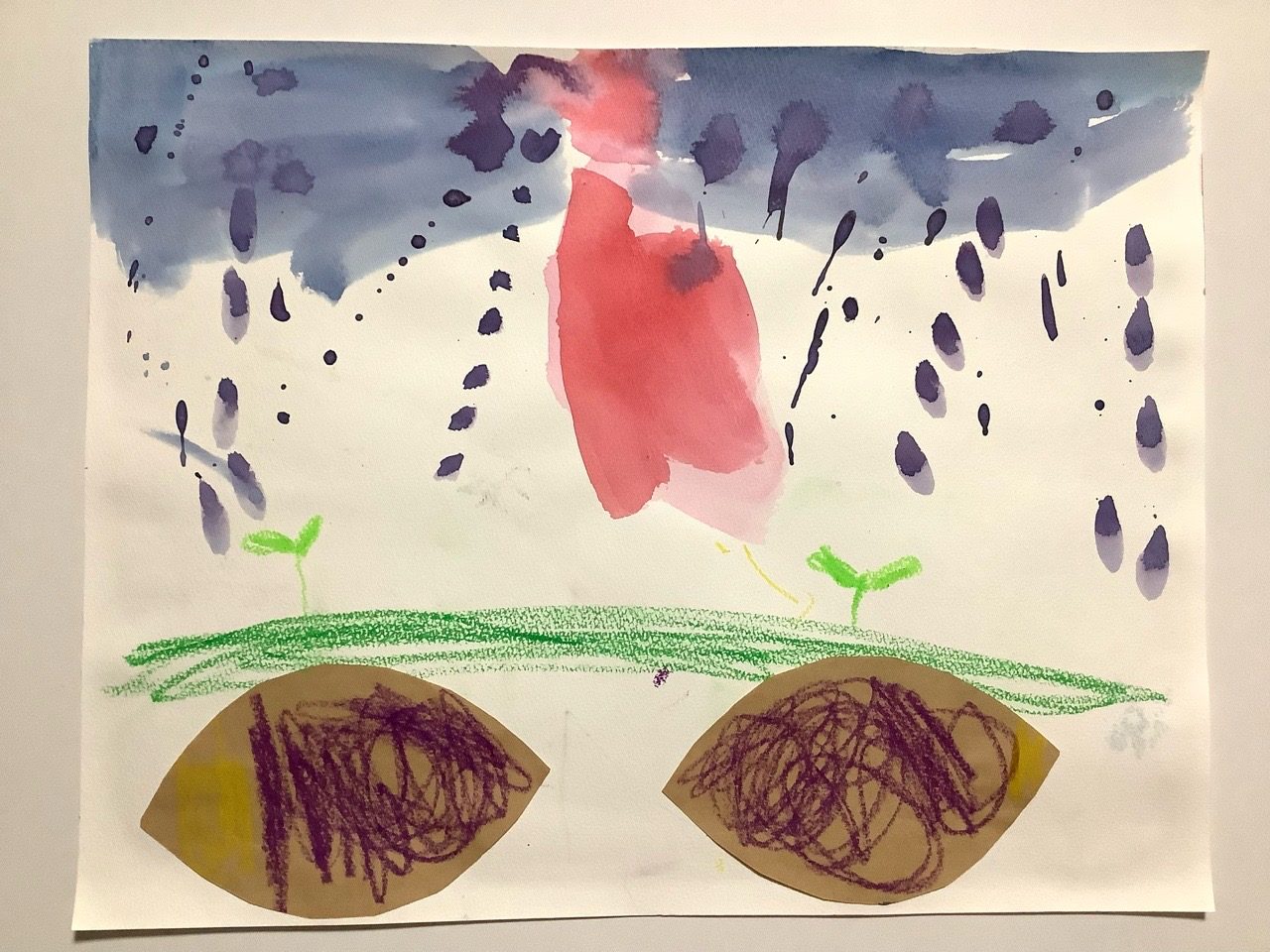 わかめせんせい 先生2026年1月4日 8:09 PM はなさん。 空のところに、ぽたぽた、つぶつぶと落ちてくる色があって、雨みたいでもあり、きしゃが走る音みたいでもありますね。 まんなかの赤い形は、きしゃのエンジンみたいに力がぎゅっと集まっている感じがして、とても目をひきます。 下にある茶色のおいもは、しっかり大地にうまっていて、クレヨンのぐるぐるが「つちの中」をちゃんと教えてくれます。 その上を走る緑の線が、きしゃの道になっていて、そら・じめん・つちの中が、ぜんぶ一つの世界につながっています。 はなさん、このおいものきしゃは、どこへ行くところだったのかな? ログインして返信する ↓