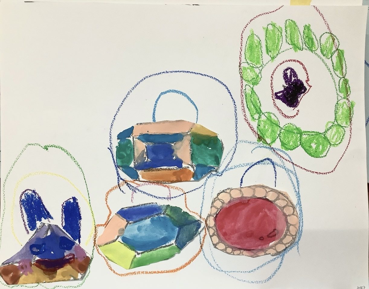 絵の具の色が重なったところや、にじんだところが、宝石のひかりや重さをちゃんと感じさせてくれますね。