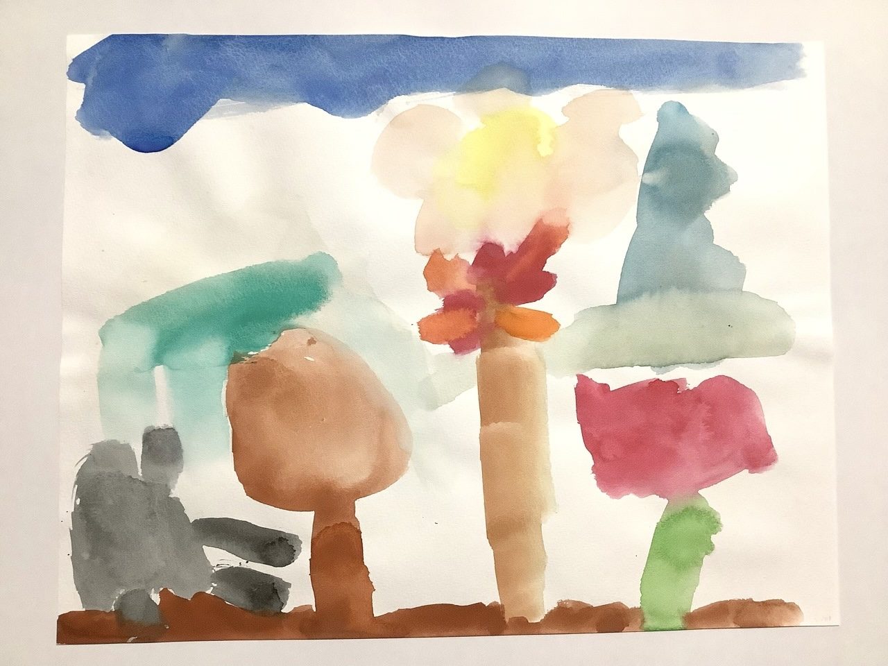 わかめせんせい 先生2026年1月4日 8:19 PM so-chanさん。 にじむ水のえのぐで、あきの空気がふわっと広がっているのが、とても気持ちいい絵ですね。 上の青い空、地面のちゃいろ、そこからすっと立ちあがる木やお花のかたちが、ゆっくり呼吸しているみたいです。 色がまざるところ、うすくなったりこくなったりするところを、そのまま楽しんでいるのが伝わってきます。 形をきっちり決めすぎず、「ここにあったらいいな」という気持ちで置かれた色たちが、あきの景色をつくっています🍁🎨 このあきのおえかき、いちばんすきな色はどれかな?その色は、どんな気持ちの色だったのか、聞いてみたいな😊 ログインして返信する ↓