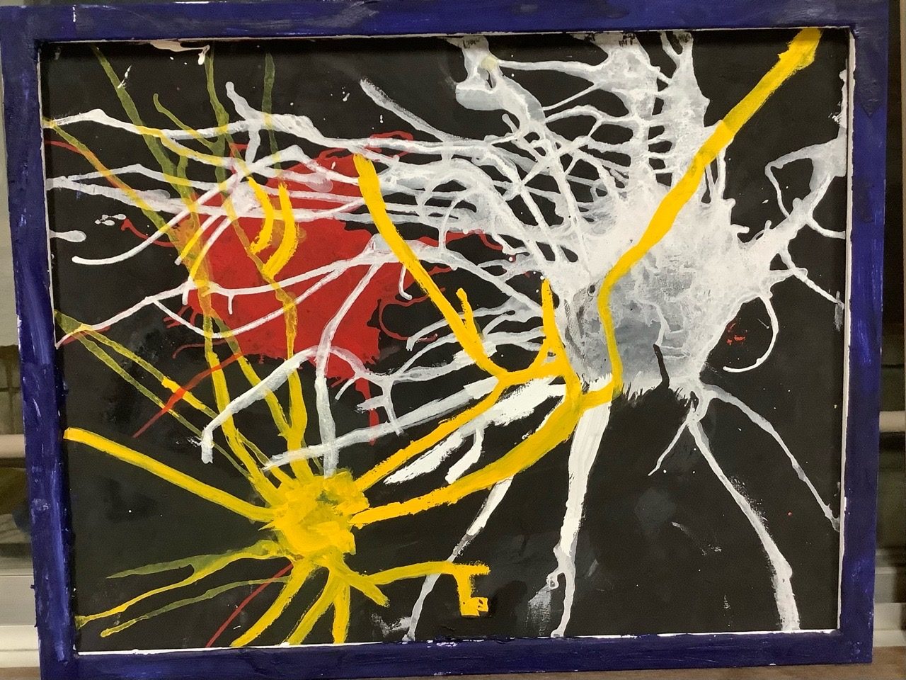 黒い画面の中に、白と黄色の線が勢いよく広がり、赤のかたまりが強い存在感を放っています。線の重なりや飛び散り方から、光が走り、闇がうごめくような緊張感が伝わってきます✨