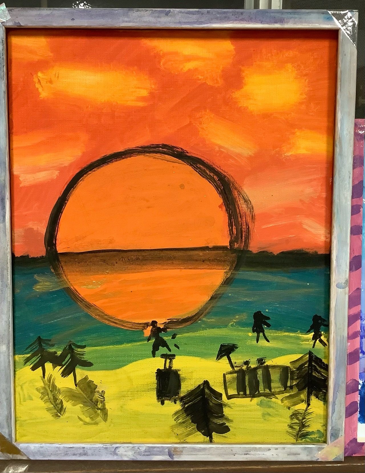わかめせんせい 先生2025年12月28日 4:06 PM みきんこさん、この作品、とても大きな「時間」を感じました。 画面いっぱいに描かれたオレンジの太陽と、空から海へとにじむ色の変化が、日光がゆっくり沈んでいく瞬間をしっかり伝えています🌅 手前の木や人のシルエットが、光の強さをより際立たせていて、少し静かで、少しさみしく、でもあたたかい気持ちになります😊 形をシンプルにまとめたことで、光そのものが主役になっていますね。 この太陽が沈んだあと、空や海の色はどう変わっていくと思ったかな?✨ ログインして返信する ↓