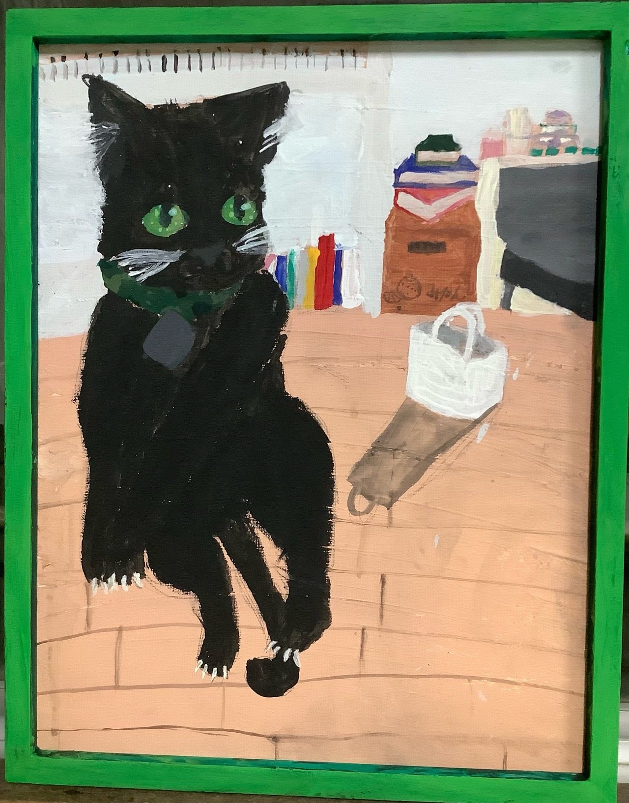 深い黒の中に、ひげや爪、そして緑の目が丁寧に描き分けられていて、静かにこちらを見つめる気配が伝わってきます。背景の床や棚、カバンの影まで描かれていることで、「家の中の時間」がゆっくり流れている感じがしますね🐈‍⬛✨