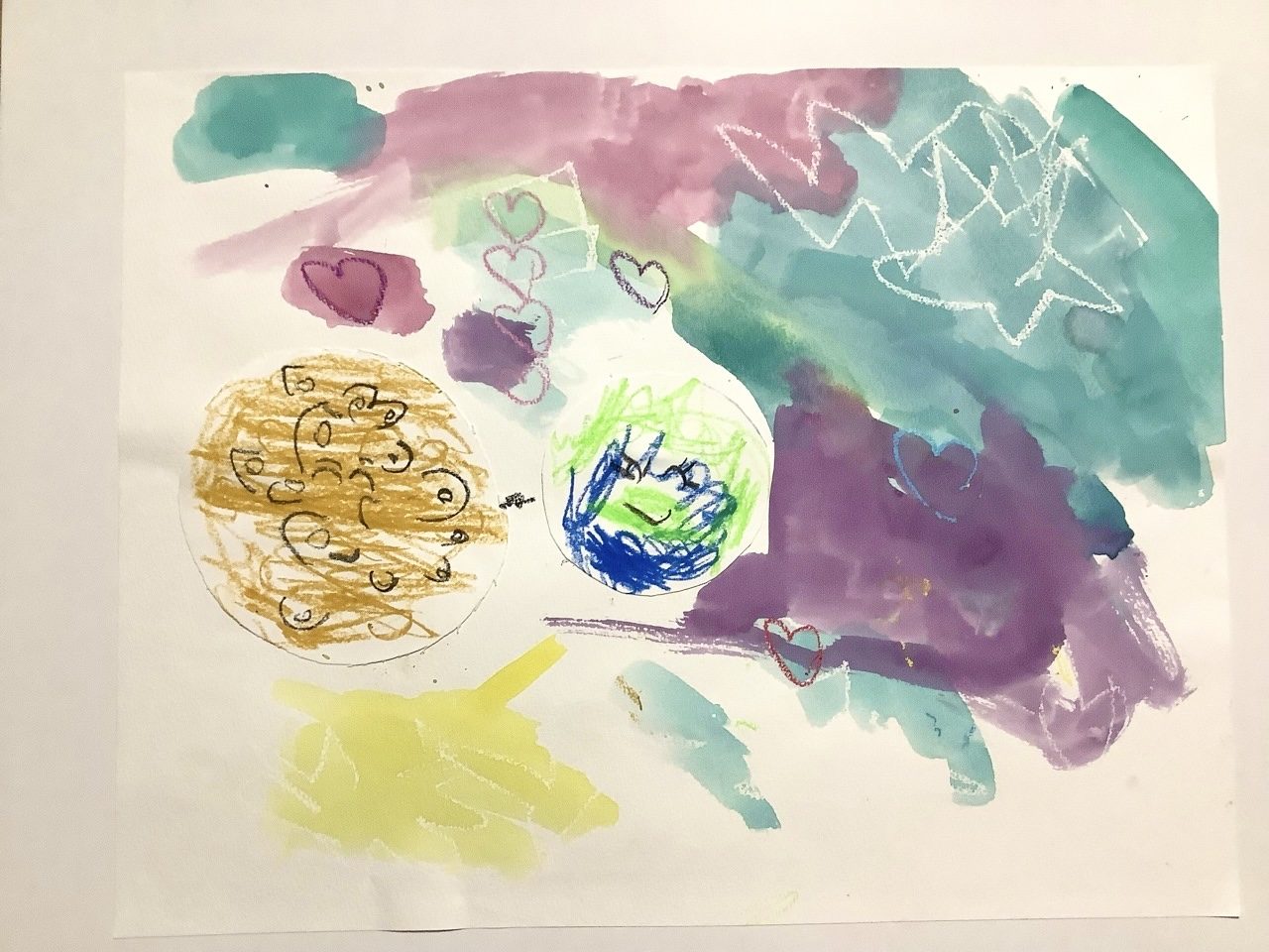 やさしい色が大きく広がって、ちきゅうさんとかせいさんが手をつないで、同じ空の中で気持ちよく浮かんでいるように見えました。