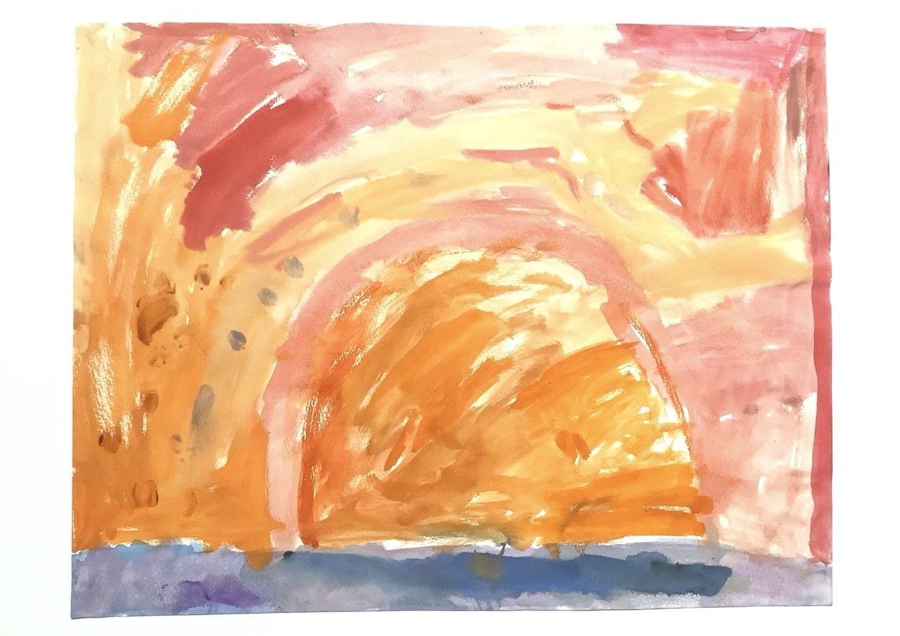 筆の動きがそのまま残っていて、光が揺れながら広がっていく感じがします。色をのばしたり、重ねたりする中で、夕方のあたたかさや静かな時間を感じていたのかなと思いました🍂