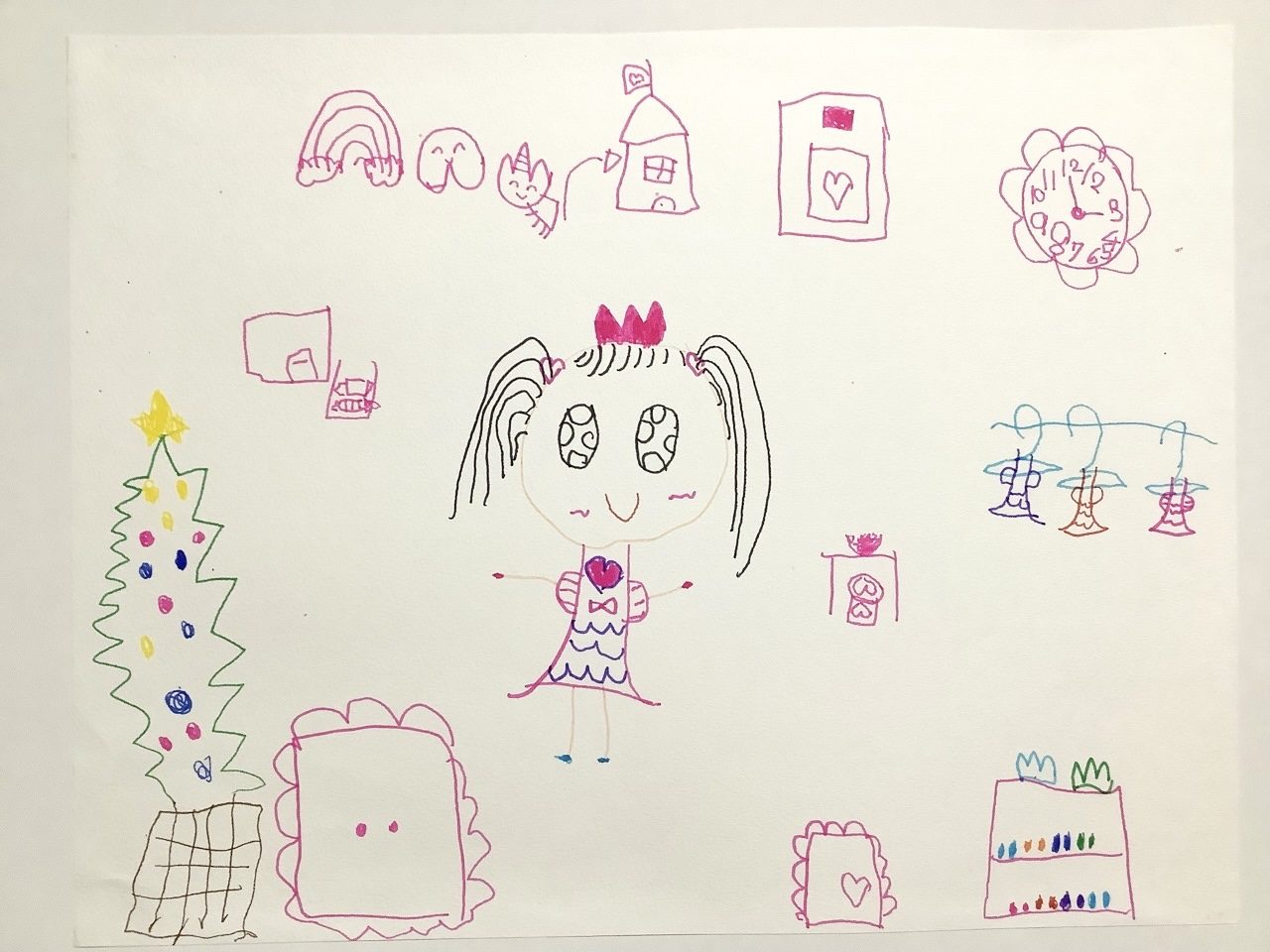 まんなかに大きく描かれた女の子が、とてもいきいきしていますね。王冠やハートのもよう、ふんわりしたドレスの線から、うれしい気持ちが伝わってきます。まわりにはクリスマスツリーやケーキ、時計やおうちが並んでいて、「3じのおやつ」の時間を楽しみにしている様子が感じられました🎄🍰
