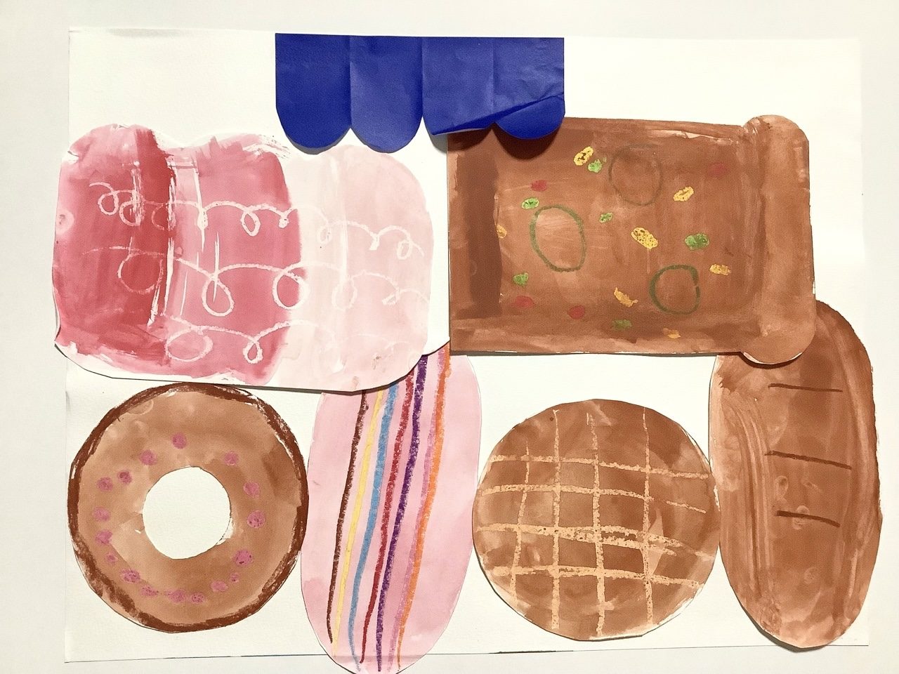 いろいろな形のパンが、ならんでいるのが楽しい作品ですね。まるいパン、ながいパン、あみあみのもようのパンなど、それぞれちがう表情があって、見ているだけでおなかがすいてきます。色のぬり方もやさしくて、ほんとうに「かわいいパンやさん」みたいです🍞🥐