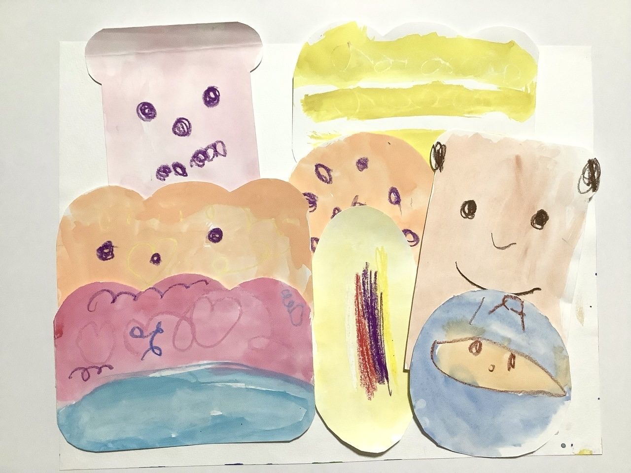 えのぐのいろもやさしくて、ふんわりしたパンのやわらかさがよくつたわってきます。かさねた色や、うすくぬったところが、とてもおいしそうです✨