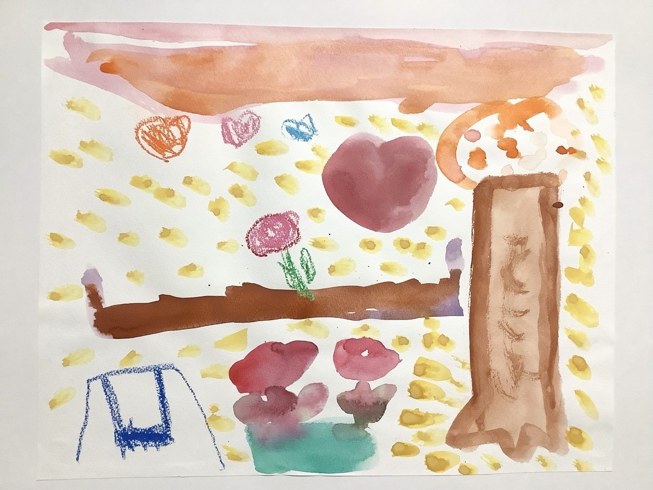 まんなかのピンクやあかのかたちは、おはなやハートみたいにもみえて、あたたかい気もちがつたわってきます。木のえも、まっすぐどっしり立っていて、「ここにいるよ」と教えてくれているみたいです🌳