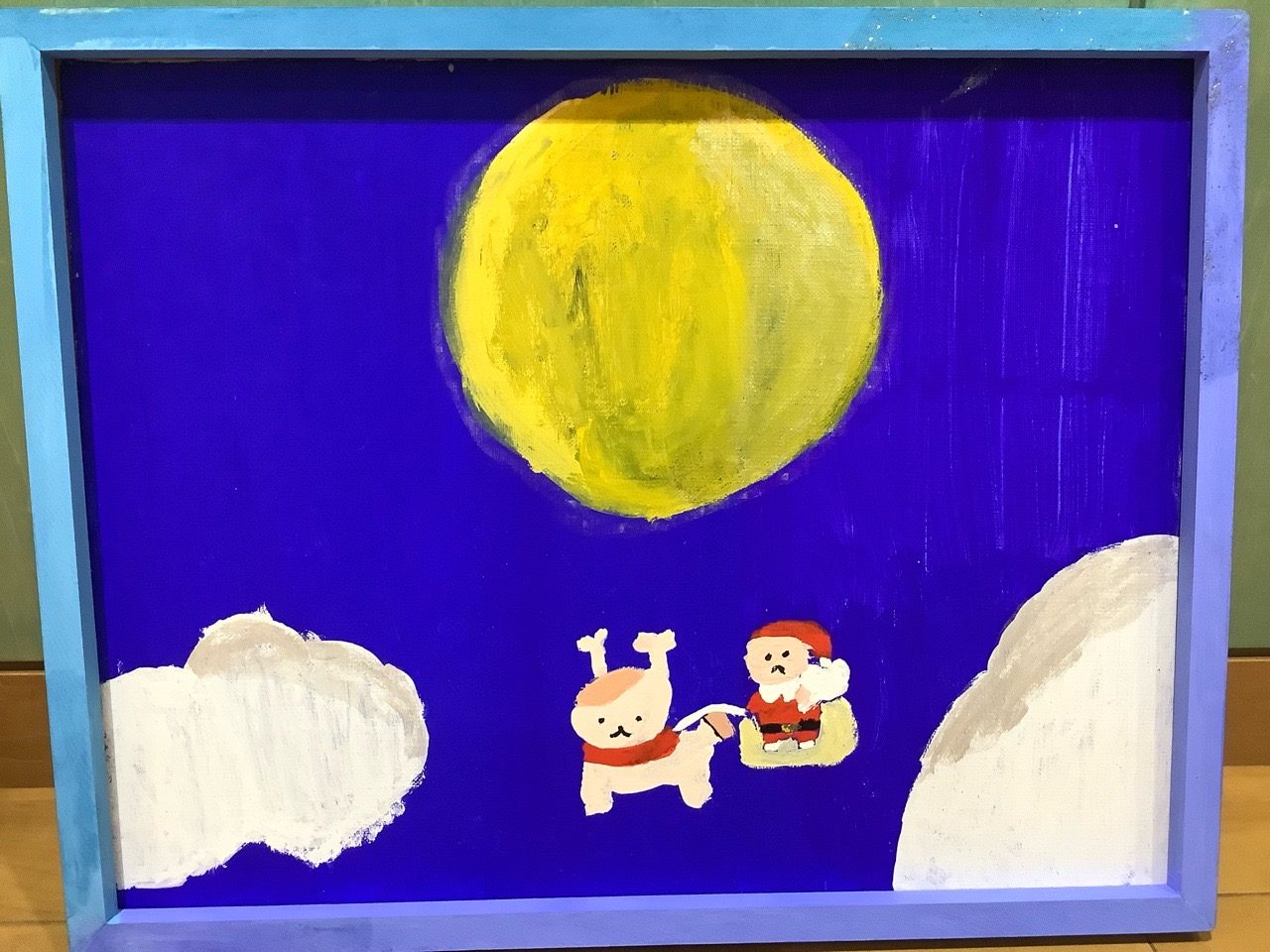 白い雲のかたまりと、月の黄色、サンタとトナカイの小さな形の対比で、空の広さや高さがしっかり感じられますね。