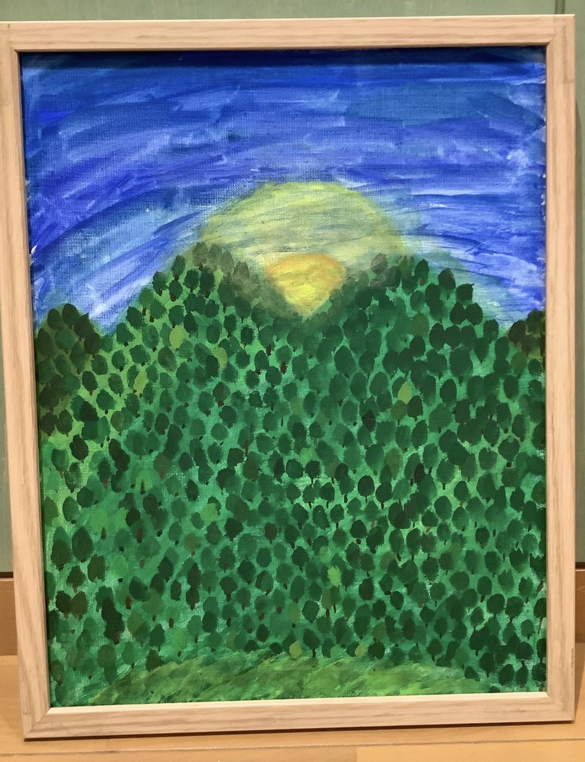 わかめせんせい 先生2025年12月28日 5:49 PM ひなさん。 深い青の空と、重なる緑の山が画面いっぱいに広がり、登っていく時間の長さや静けさが伝わってきます⛰️🌿 木々の点の積み重ねや、山の向こうににじむ光から、少しずつ高度が上がっていく感覚をていねいに表しているのが印象的です。 息を整えながら、一歩一歩進むような気持ちで描いていたのだろうな、と感じました😊 形をくり返しながら世界をつくる力は、これからの表現を大きく支えてくれます🎨 この山のてっぺんに立ったとき、どんな景色が見えると思いますか?✨ ログインして返信する ↓