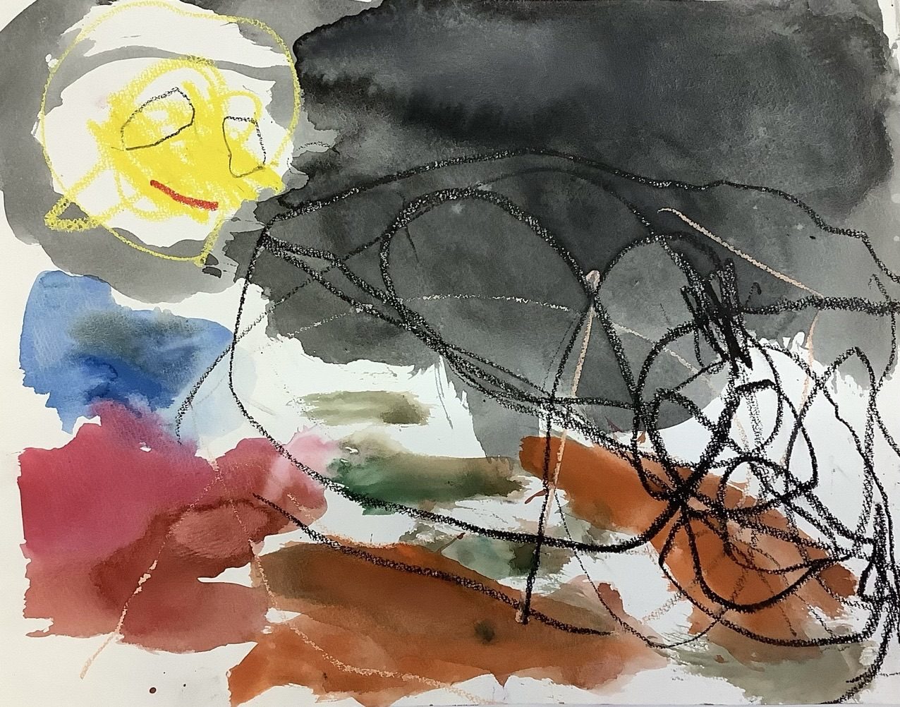大きなおつきさまが、ふわっと画面にあらわれていて、とても目をひきました。黄色のクレヨンの線と、にじんだえのぐの色がかさなって、夜のおそらの空気がつたわってきます。ぐるぐるした黒い線は、お出かけで通った道なのかなあ・・、うごきやドキドキした気持ちみたいですね。