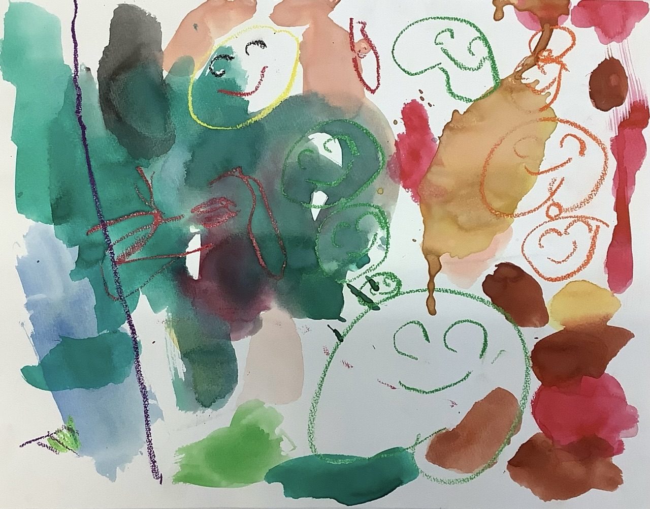 みどりやあか、ちゃいろのえのぐが、にじんだり、かさなったりして、えのぐ同士がおはなししているみたいですね。くるくるした線や、にっこりしたおかおが、あちこちにあらわれていて、とてもにぎやかです。