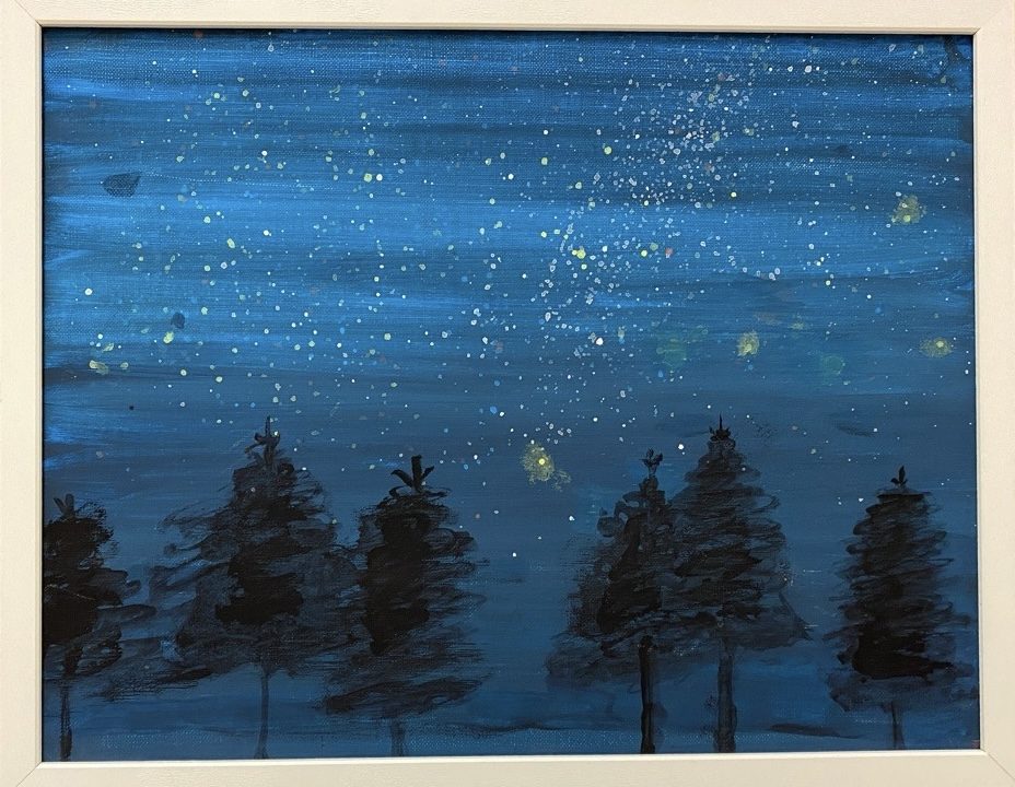 絵の下のほうに並ぶ木々のシルエットが、夜の広がりや奥行きをしっかり支えていて、空の大きさを感じさせてくれます🌌