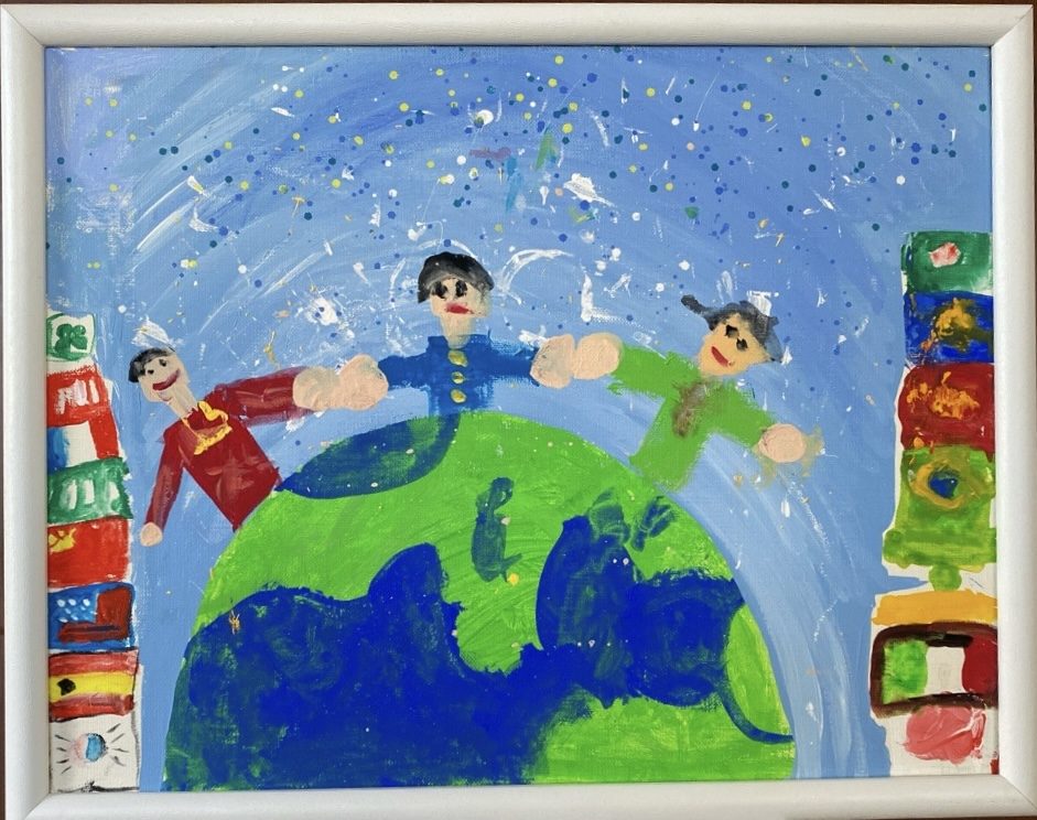 青と緑を中心にした地球の色と、服の色のちがいが、世界の広さや多様さを感じさせます🌍✨