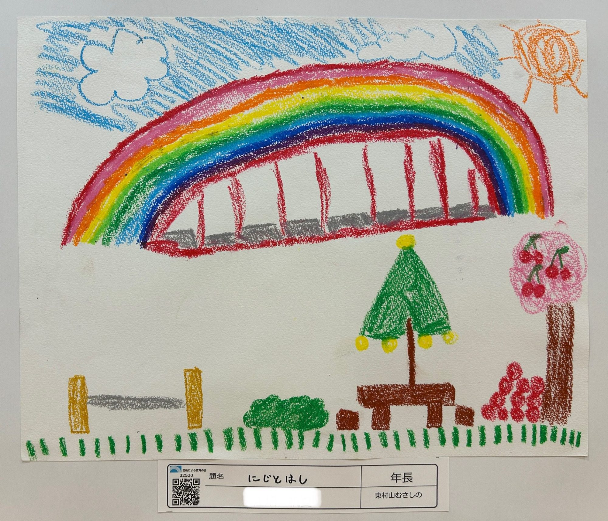 そらいっぱいに大きくかかったにじが、とてもきれいですね。あか・だいだい・きいろ・みどり・あお……いろがじゅんばんにそろっていて、ていねいにえらびながらかいたことが、よくつたわってきます🌈