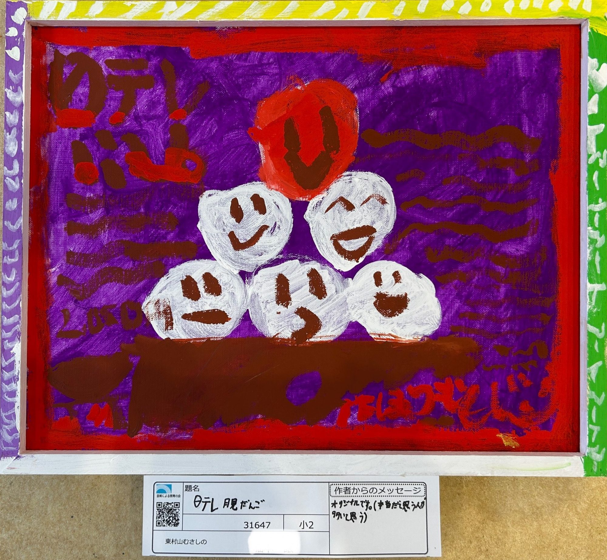 紫の背景に白いおだんごが積み重なり、それぞれに表情が描かれているのがとても印象的です。赤い月のような形と文字のような線が画面にリズムをつくり、お祭りのにぎやかさが伝わってきます🍡🌕