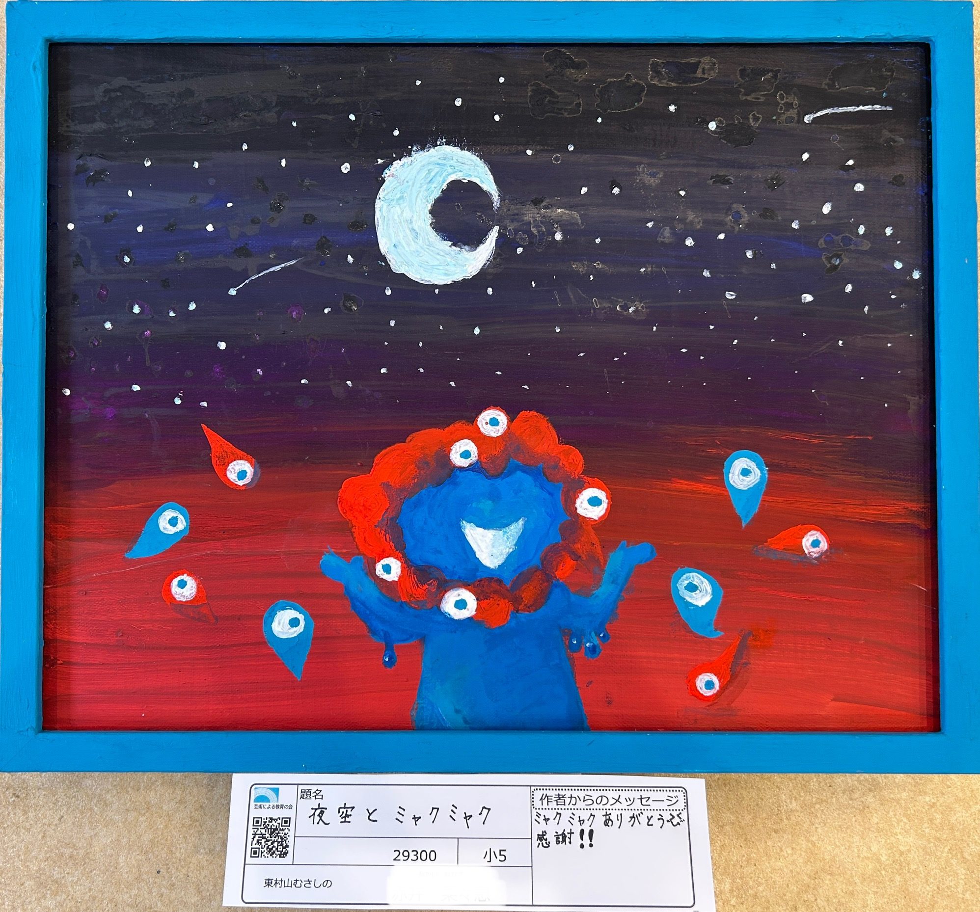 暗い空の中でも、ミャクミャクの表情や色がはっきり見えて、特別な存在として大切に描かれている気持ちが伝わってきました。感謝の言葉が、そのまま絵の明るさになっているようにも感じます😊