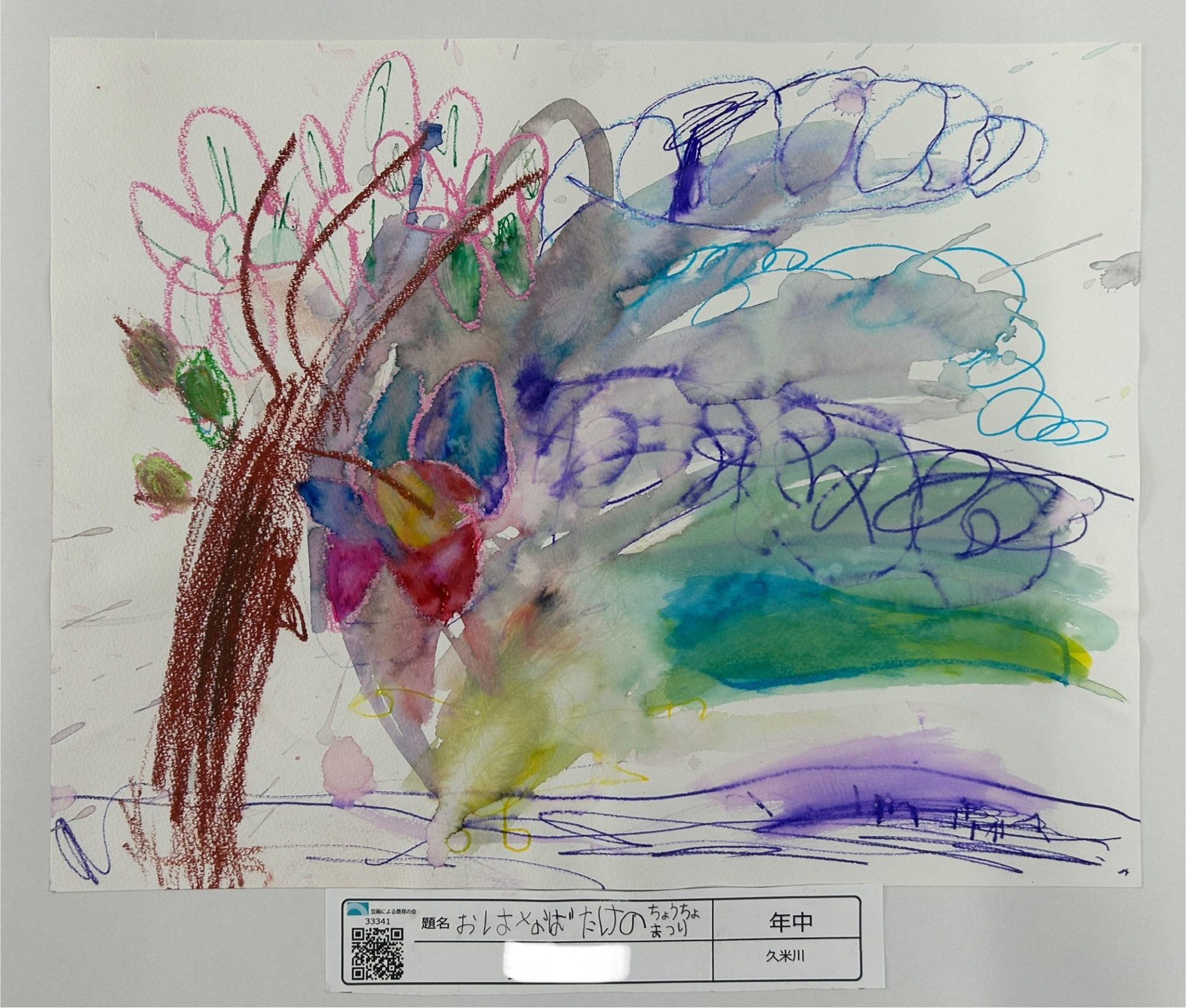 水えのぐのにじみと、クレヨンの線が重なって、私は「にぎやかでたのしいおまつりだな」と感じました。色がまざるところに、わくわくした気持ちも残っているようです🎨✨