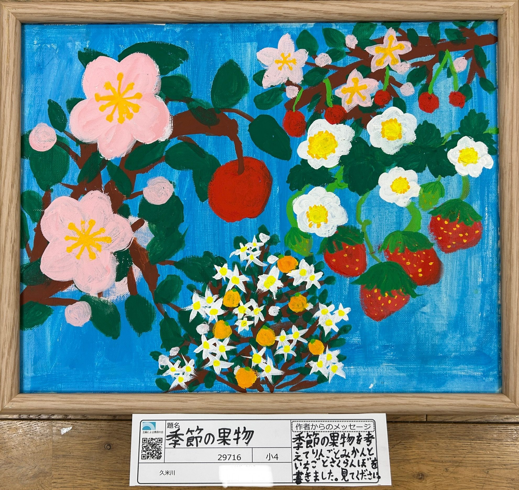 青い背景の中に、りんごやいちご、白い花やピンクの花がのびのびと配置されていて、画面いっぱいに季節のにおいが広がっているように感じました🍎🌸