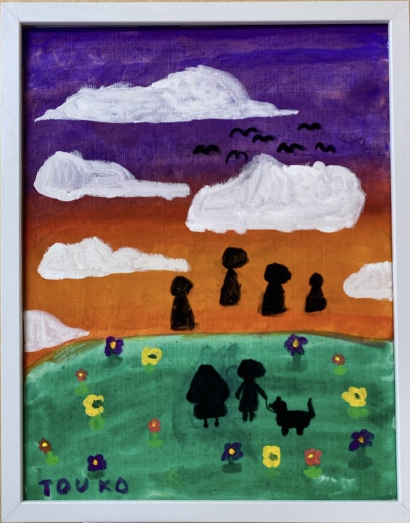 丘の上に立つ人たちや犬、手前の花の配置から、遠くを見つめる時間の流れが感じられます🌇☁️