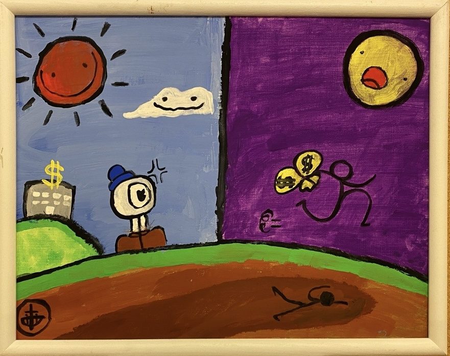 明るい空と笑顔の太陽、そして反対側の紫の世界に描かれた動きのある人物が、まるで物語の場面を見ているようです🎨🌞