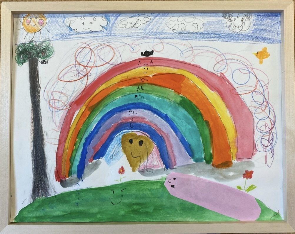 大きな虹が画面いっぱいに広がり、色の重なりや太さの違いから、動きやリズムが伝わってきます。まわりに描かれた雲や線、へびちゃんの形も、にぎやかな公園の空気をつくっています🌈☁️🐍