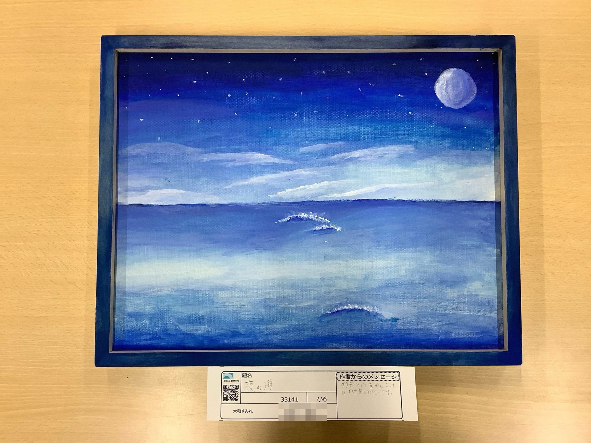 深い青から淡い水色へと重なる色の層が、夜の海の広さと静けさをゆっくり伝えてきます。