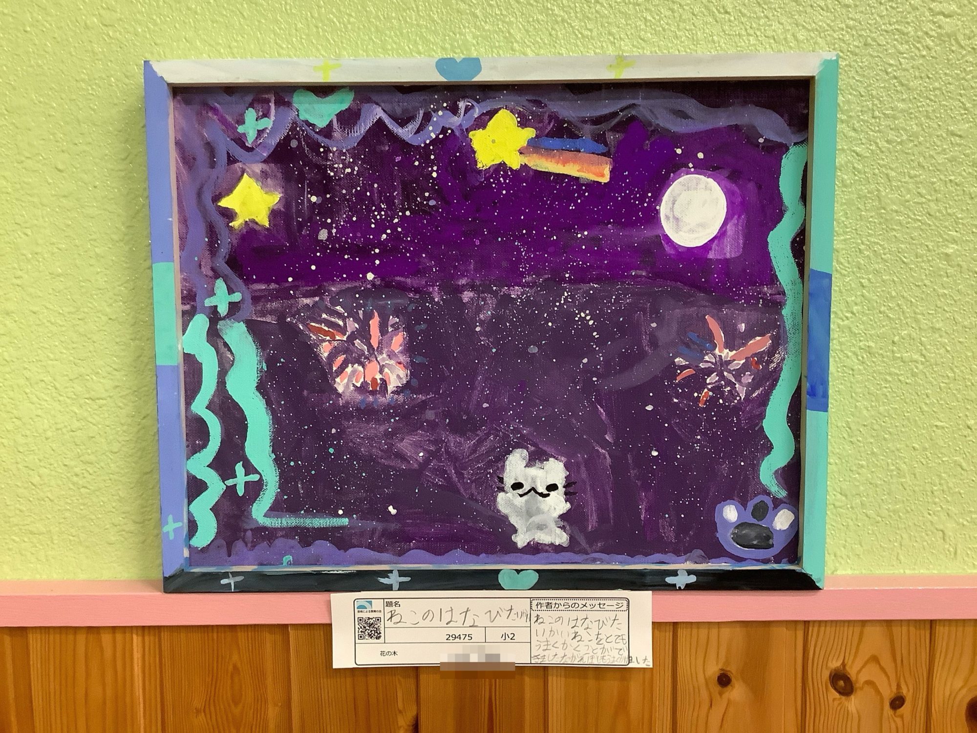 色を重ねたり、点を散らしたりすることで、夜のにぎやかさと楽しさが生まれています🎆🐱