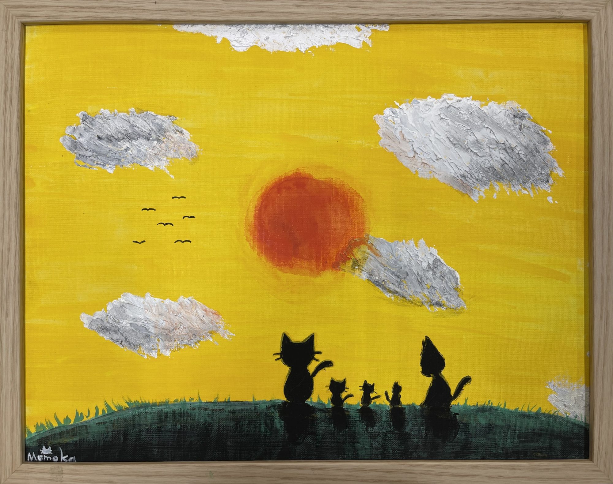夕日の大きなまるが空のまんなかにあって、黄色い空に白い雲がふわっと浮かび、しずかな時間がひろがっています。