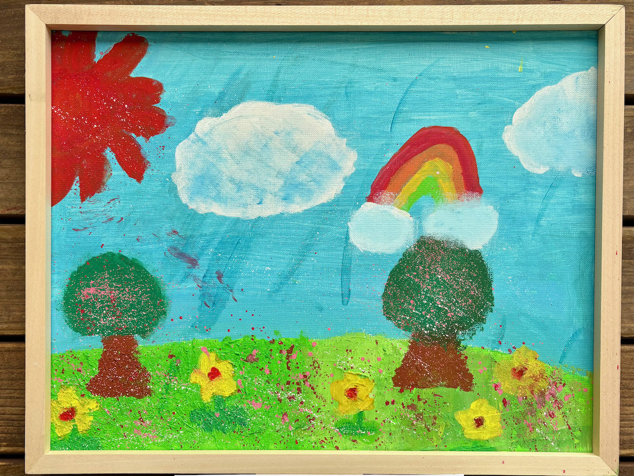 わかめせんせい 先生2025年12月30日 9:19 AM kanami0802さん。 青い空にふんわり浮かぶ雲と、やさしい色の虹が目にとまります。🌈☁️ 緑の大地に並ぶ木々や、ぽんぽんと散らした花の色から、春の空気が画面いっぱいに広がっているのを感じました🌸🌿 赤い太陽の強さと、やわらかい草の感じが一緒にあるところに、あたたかさと楽しさが同時に伝わってきます😊 私はこの絵を見て、風が吹いて花がゆれる音まで想像しました。 この場所では、どんなにおいがしていたと思いますか? ログインして返信する ↓