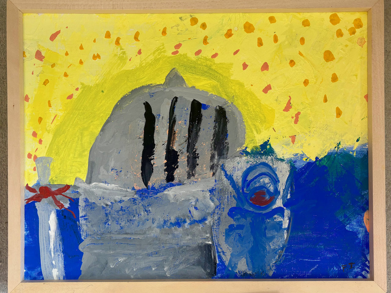 大きなゆうしゃが画面の真ん中にどんと立ち、灰色の体や縦に入った黒い線が、強さと重さを伝えています。背景の黄色と青のはっきりした色分けや、赤いモチーフが、物語の舞台や緊張感を生み出しています。