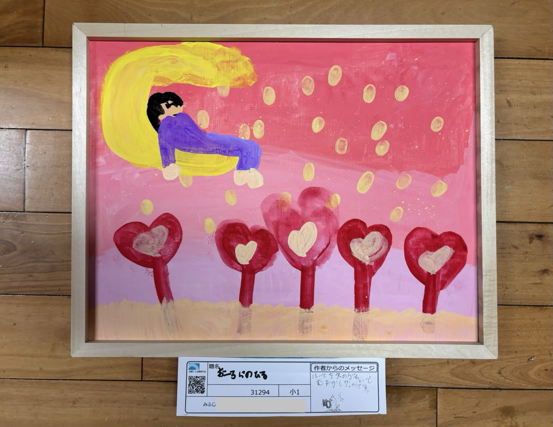 わかめせんせい 先生2025年12月30日 9:52 AM licorunrunさん 空いっぱいに広がるピンクやオレンジの色が重なって、やさしく光る空が描かれています。 月の上でねむっている人や、空からふってくる丸い光、地面に並ぶハートの木が、夢の中の世界みたいですね🌙✨ 楽しいことや、しあわせな気持ちが、そっと空に広がっていくように感じます。 色を大きく使って、空と地面を分けたところも、世界がはっきりしていてすてきです🌈 この空の下では、どんなことが起こっていると思いますか?💖 ログインして返信する ↓