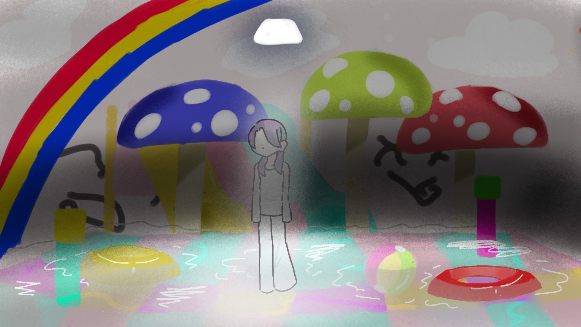特に大きなキノコのシルエットと、虹が画面の上をやさしく包む構図がすてきです。キャラクターの無表情さも、夢の中の「わたし」を見るようで、世界観に深みを出していますね。