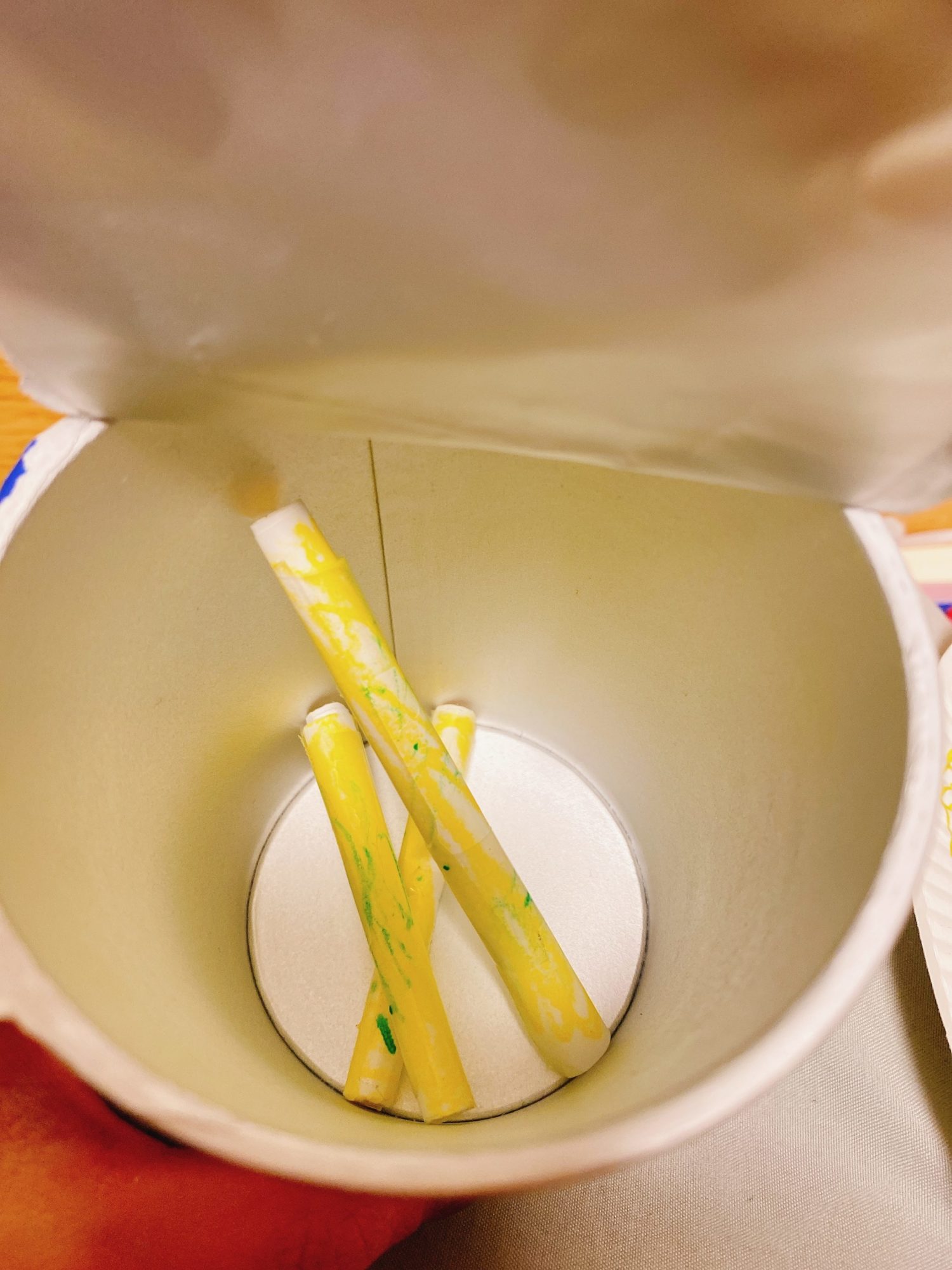 紙コップの中に「じゃがりこ」が3本だけ…という構図が、なんだか物語のワンシーンのように感じられます。黄色の色づかいや、ちょっとした緑の模様も手描きならではの味わいがあって、とてもチャーミングです。