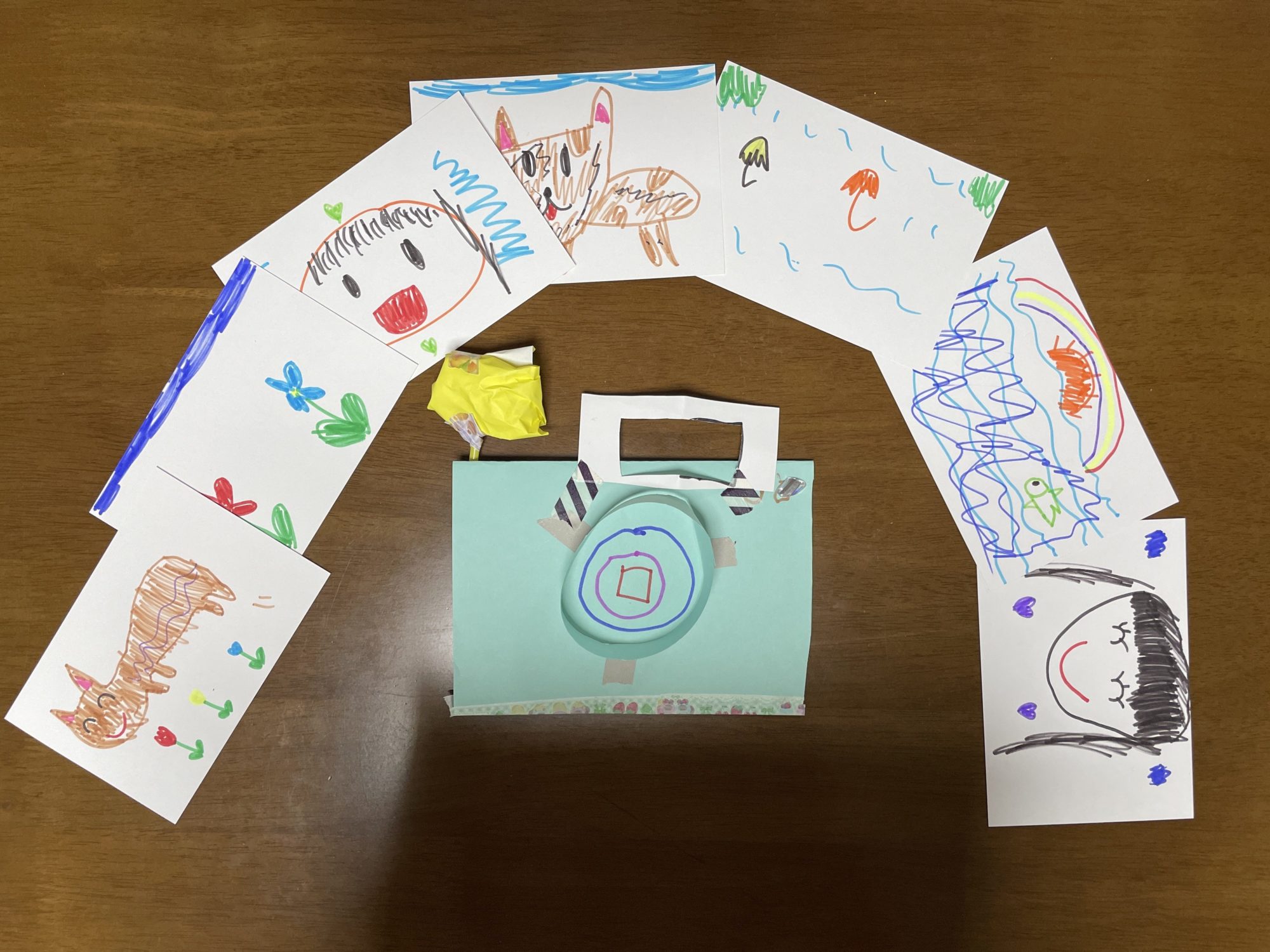 まわりにぐるりと並んだ絵が、ちささんがこのカメラで撮った写真だと思うと、一枚一枚が思い出のように見えてきます。動物の写真もあれば、お花、海、元気な笑顔…ちささんが見つけた「かわいい」「たのしい」がそのまま写っていて、とてもあたたかい作品になっています。