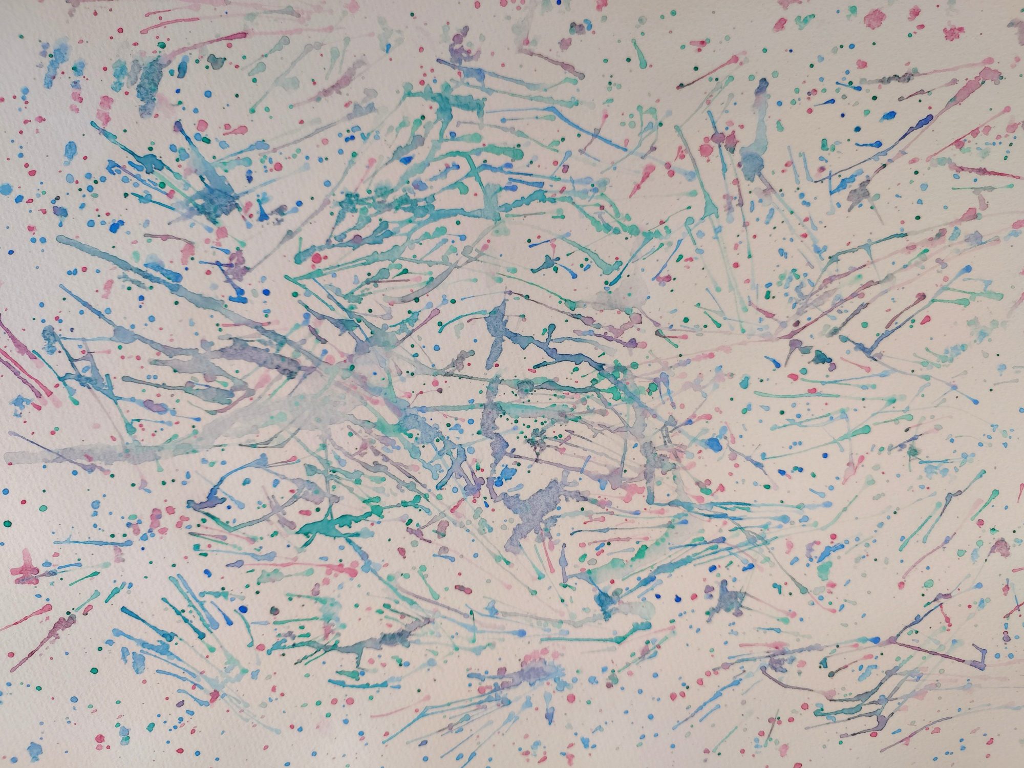 ストローで吹くたびに色が跳ねたり細くのびたり、思いがけない形が生まれていくのを楽しんでいる様子がよく伝わってきます。色の重なり方も自然で、淡い色と鮮やかな色が混ざり合いながら心地よいリズムをつくっていて、見ているこちらまで元気になります。