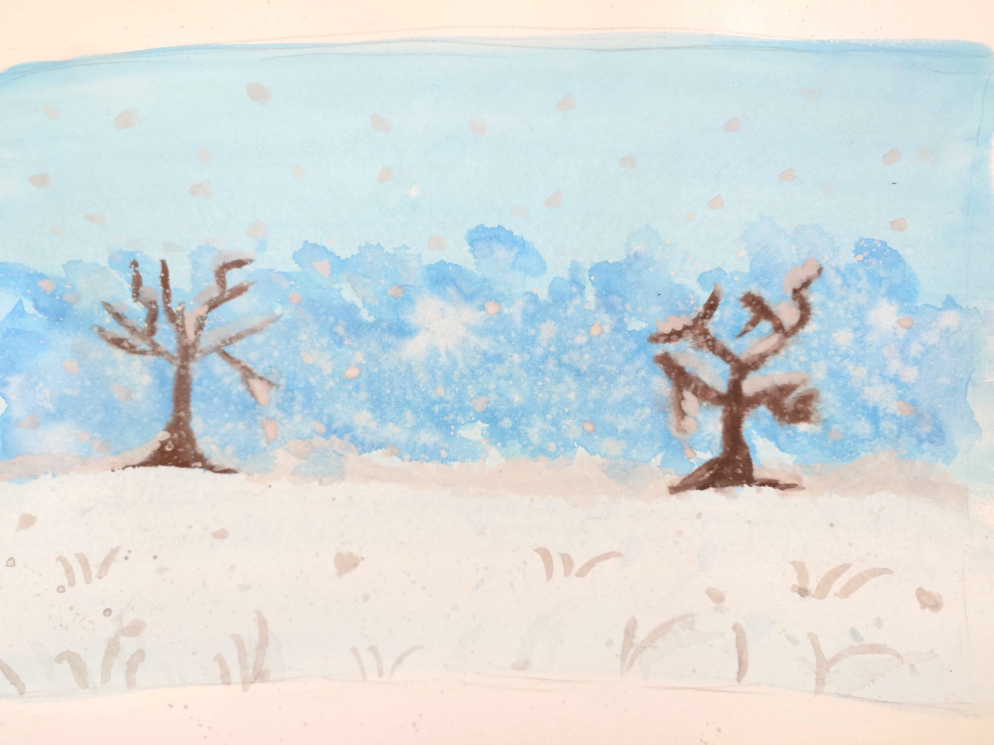 木に雪を積もらせるのがうまく描け、左右の木のイメージを変えてみた。雪景色での光の具合も出せた。スパッタリングで雪を降らせるのは楽しい。