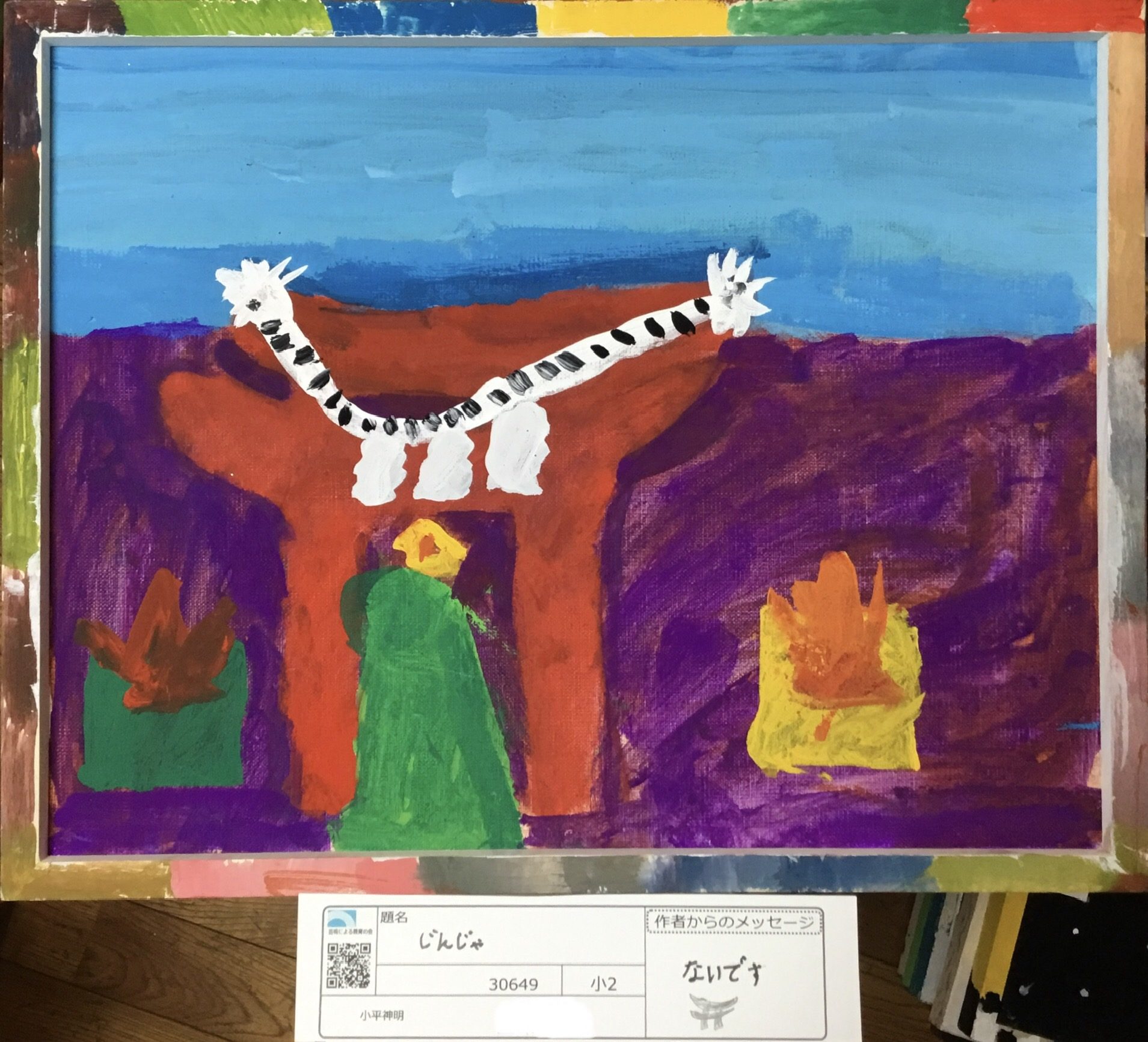 大きな鳥居が画面のまんなかにどんと立ち、赤や紫、青の色が重なって、場所の空気がはっきり伝わってきます。鳥居の上のしめ縄や左右のかざりも、形をしっかりとらえて描かれています ⛩️✨