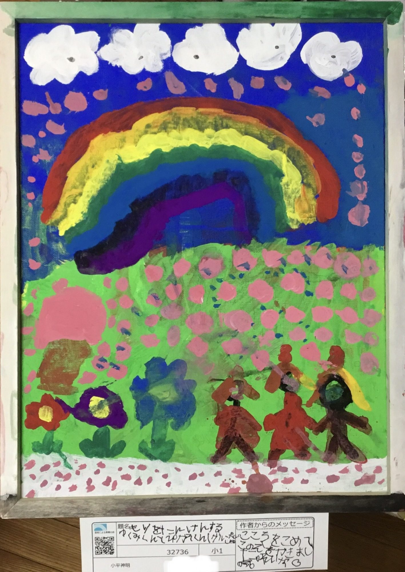 にじが大きく空にかかり、花がいっぱいの森の中を、みんなで歩いている感じがとても楽しそうですね 🌈🌸